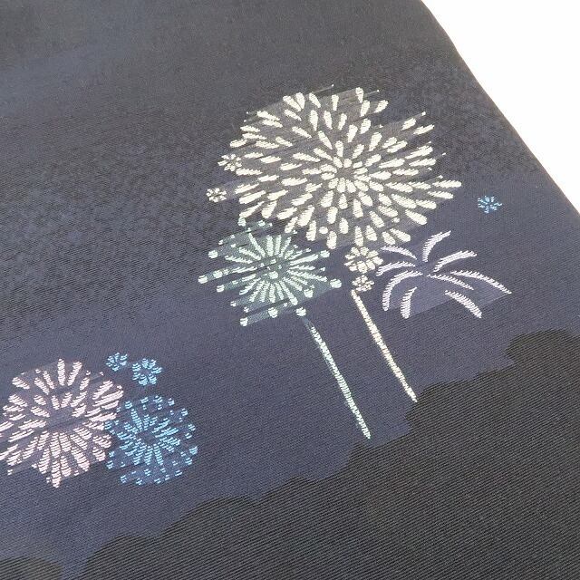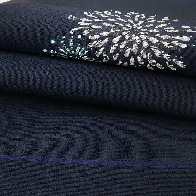 藍鉄色の地に込められた夏の風物“打ち上げ花火”の織り出し、それは精微な織に聞こえてくる涼の風音、シンプルながら潤いある夏の煌きがとても印象的なひと品、お気に入りの着物と合わせて、さぁ素敵な女性を表現してみましょう。