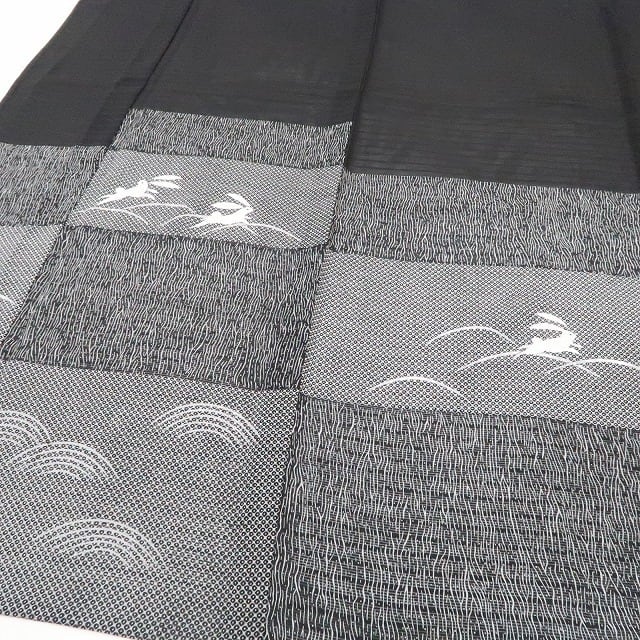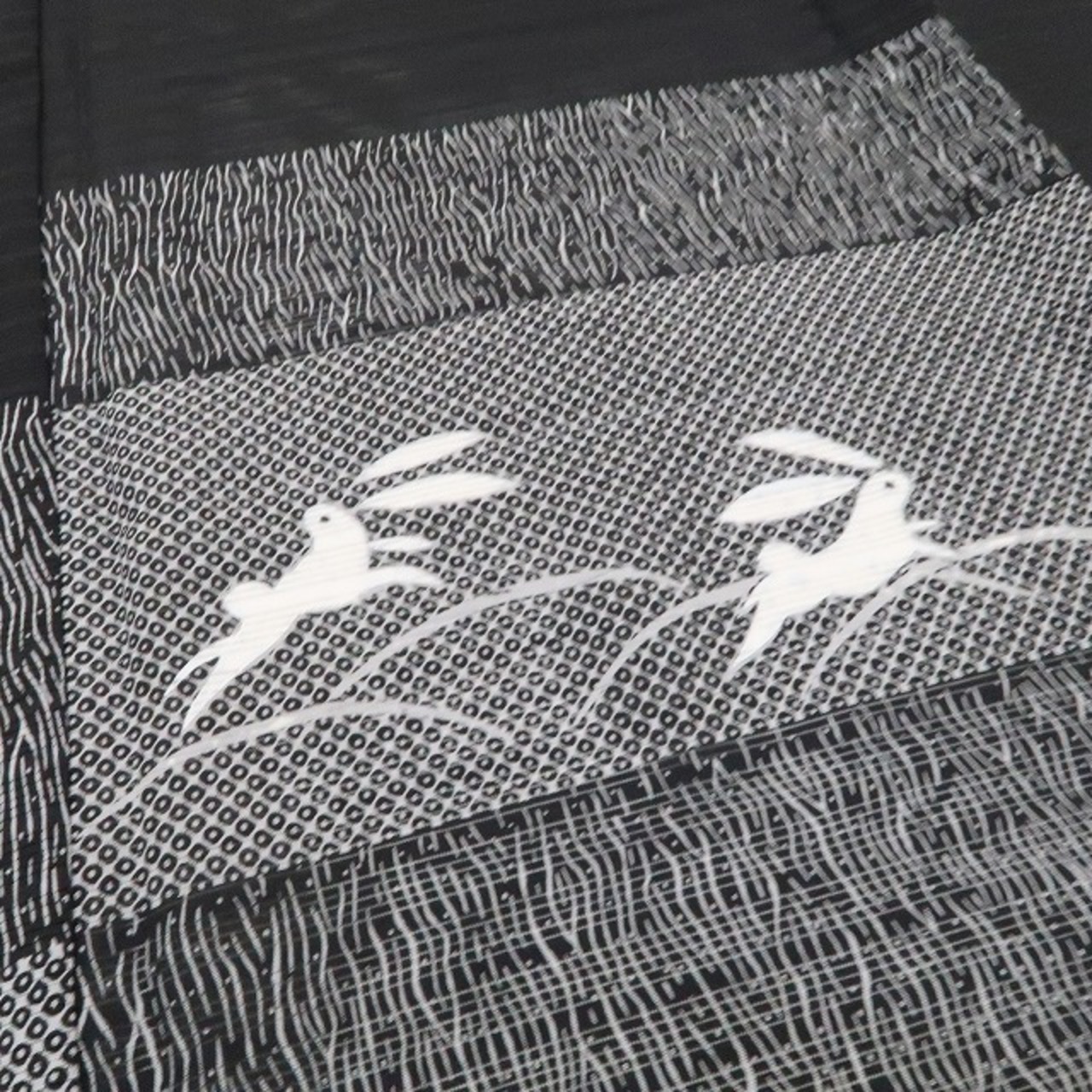 シックな黒の色地を抜ける涼やかな風、格子状の濃淡に添えられた愛嬌兎のデザインモチーフ、巧みな意匠に醸し出されるえも言われぬお洒落感は必見!正にモダン創作の王道を行くひと品…正絹独特のしっとりとした風合いが着物の味わいを一段と深みある趣に変えています。