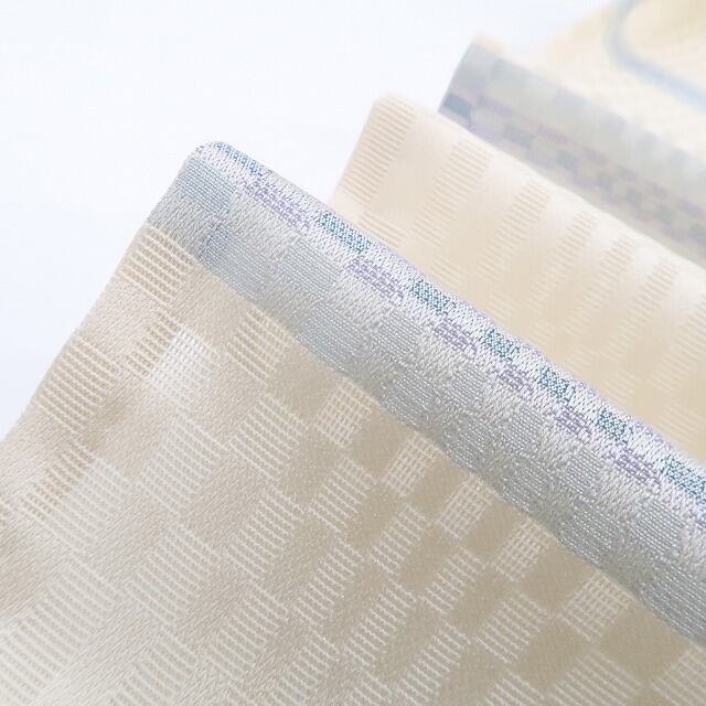 大人びた練色の地に揺らぐ変わり市松のデザイン格子、それは紋紗の透明感に