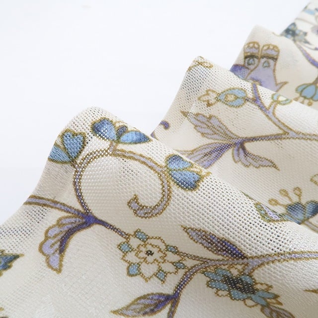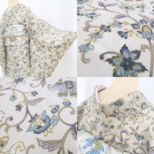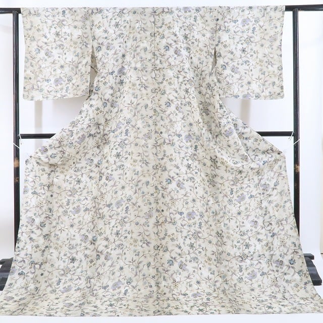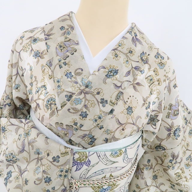 二本の経糸で緯糸一本ずつをからめて織り上げたシンプルなもじり織で、絽以上に透け感がある“紗”。こちらのように織り柄のある紋紗、紬糸を使った紬紗などがあります。7月、8月の盛夏はもちろん、白襦袢ではなく色襦袢を重ねて透け感をなくして悪戯な気温の変化を見せる6月、9月の単衣の季節にも着られます。