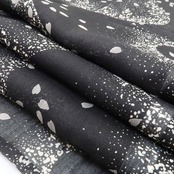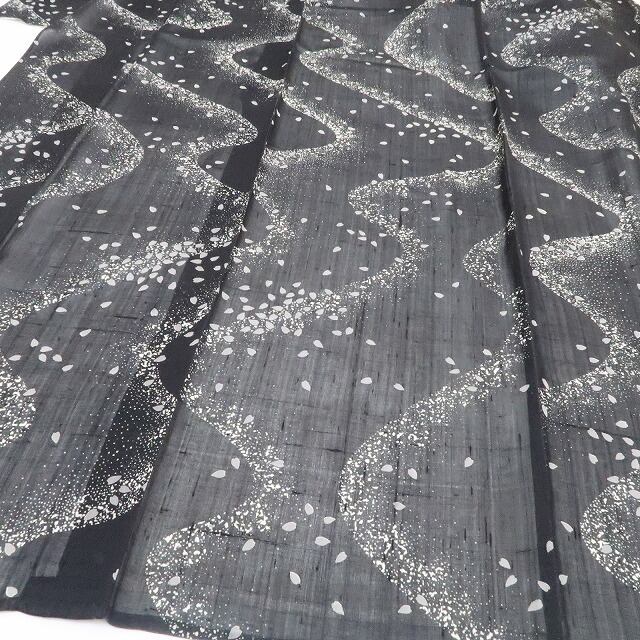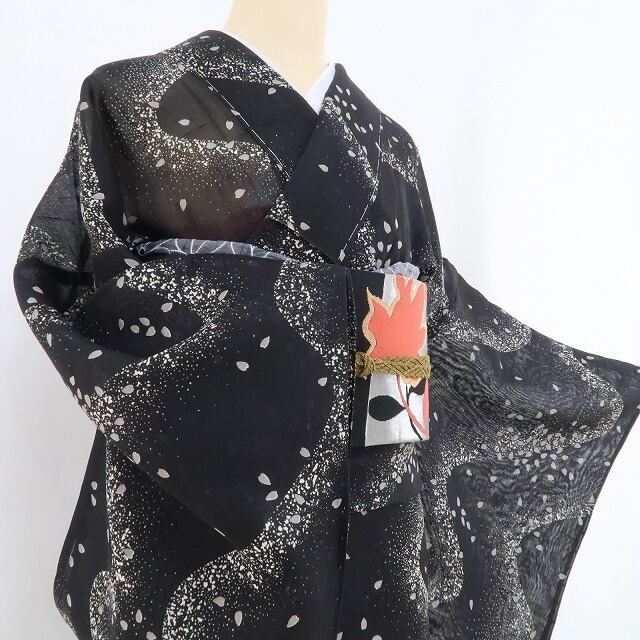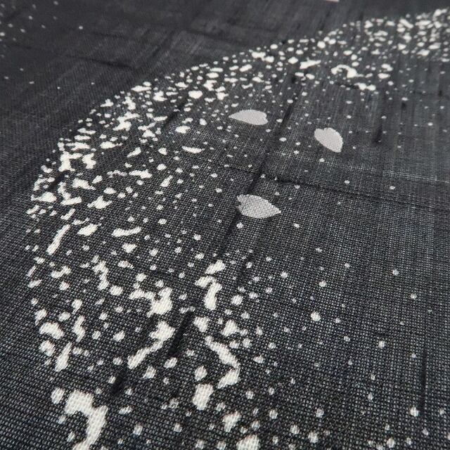 シックな黒の色地に描き込まれた桜散らしのデザインモチーフ、それは紗の透明感に心地よいインパクトを残す素敵な風の贈り物、高級絹糸が創り出す唯一無二の自然な風合いは正に夏芭蕉ならでは。