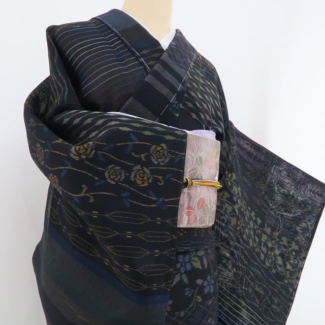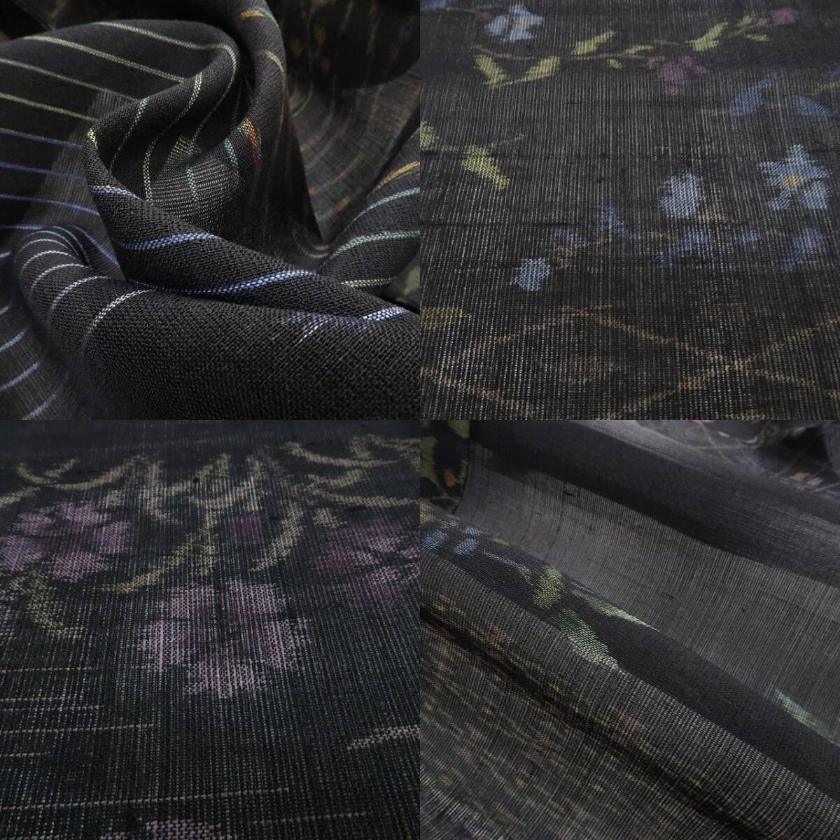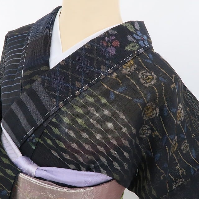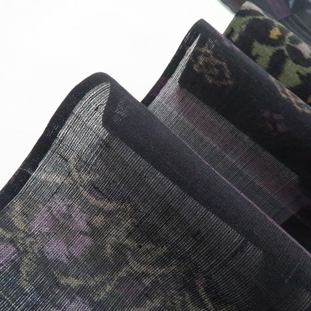 黒の色地に広がる清々しい紬の素材感、紗の涼感に多彩ながら爽やかな色味で浮かび上がる可憐な花々、それは正に丁寧に紡がれた手座繰りの真心、民芸創作品ならではの豊かな温かみが魅力の一枚、受け継がれる伝統紬の味わいを存分にお楽しみいただけます。