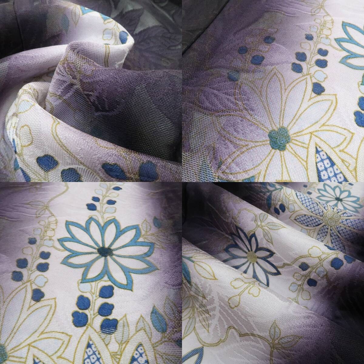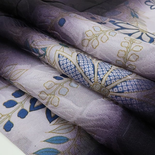 紗の透明感にシックな葡萄色の色味が放つ大人びた表情、縦縞状の濃淡に艶めいた陰影を映す精微な花のデザインモチーフ、意匠に醸し出されるえも言われぬお洒落感は必見!それは正に創作小紋が奏でる心地よい夏の涼味、お洒落着の代表“小紋の魅力”に溢れ女性のさりげないセンスが薫るひと品、帯合わせで様々な夏の装いをどうぞお楽しみください。
