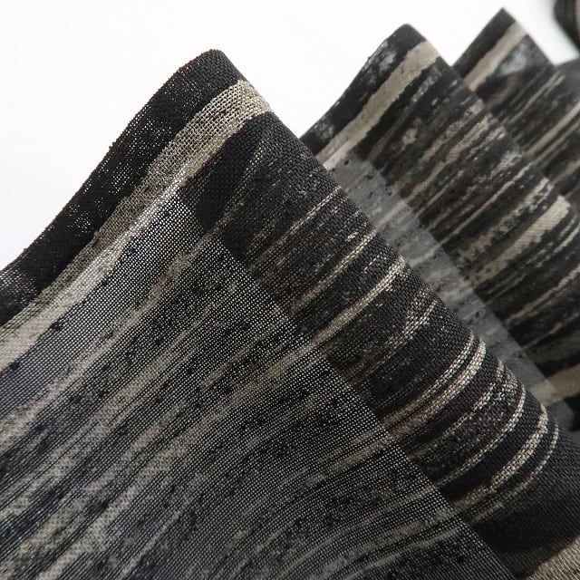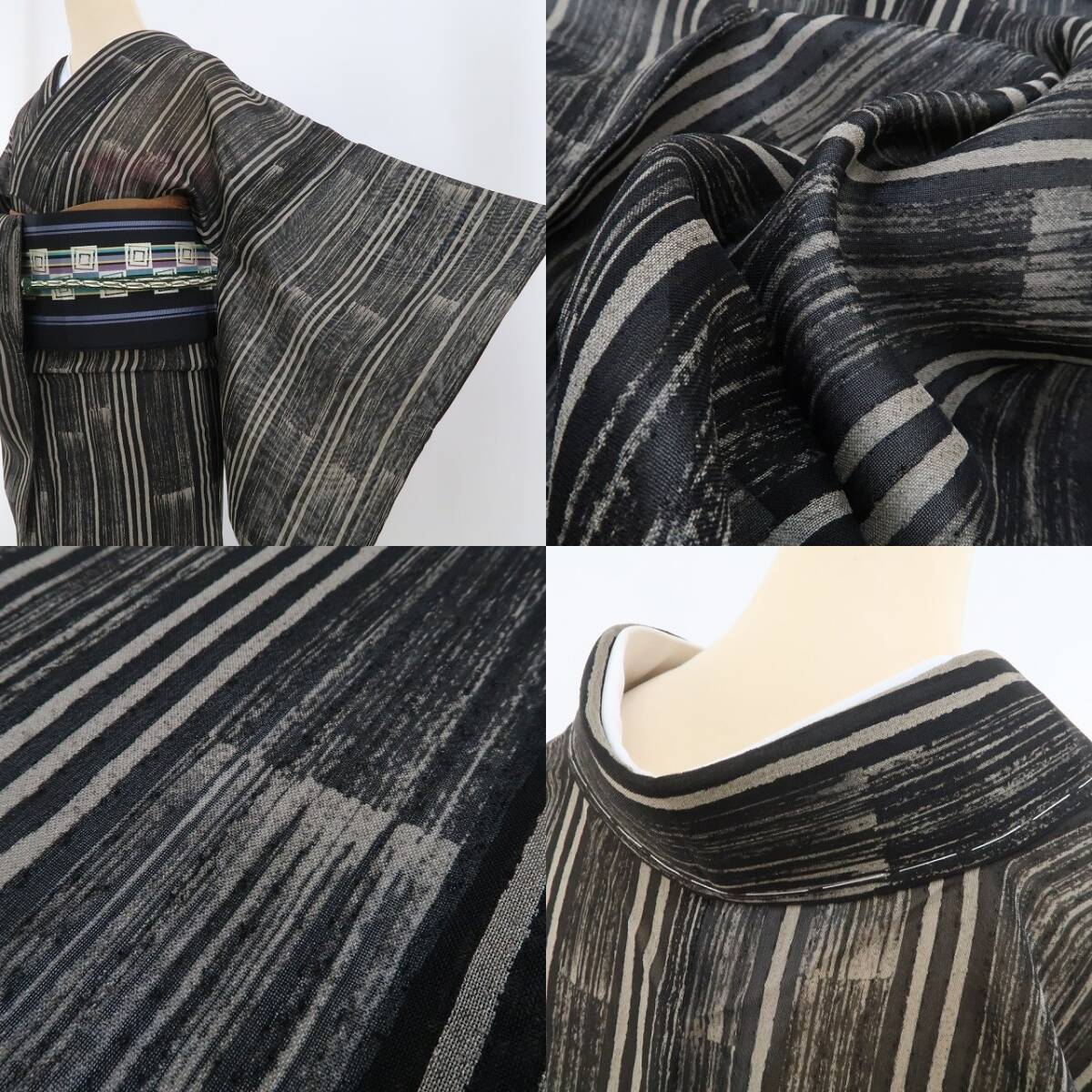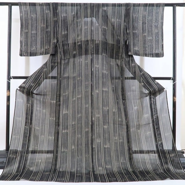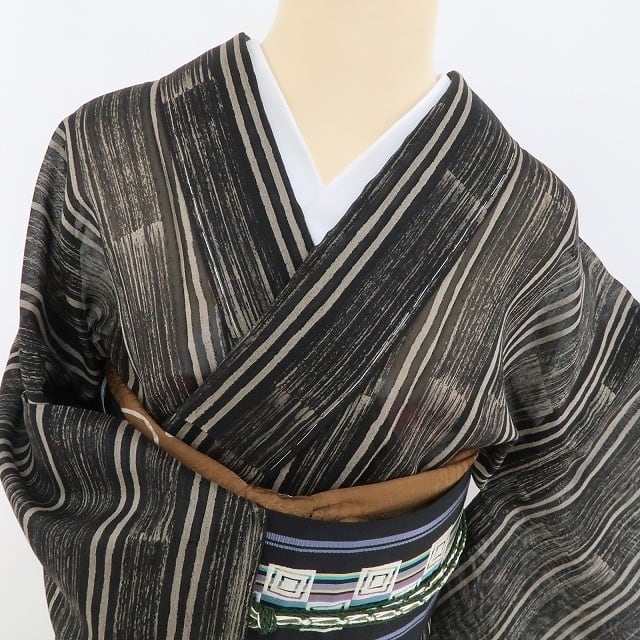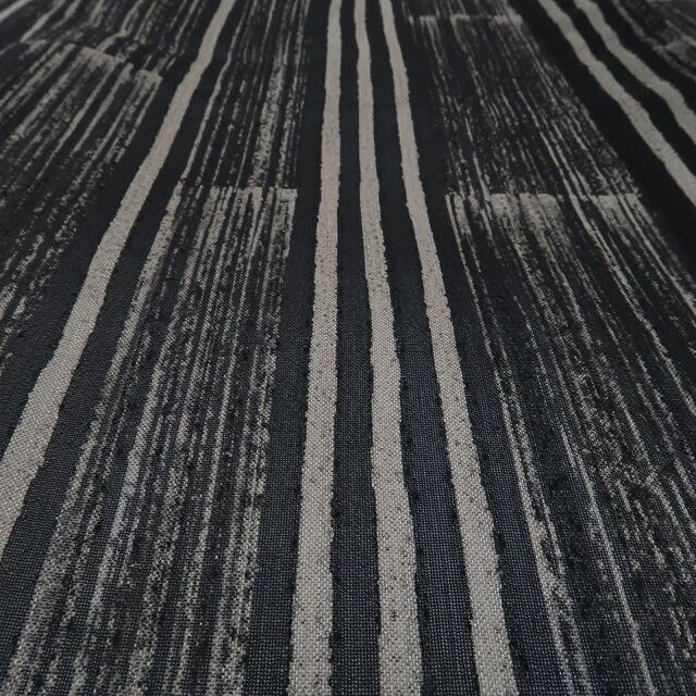 黒と亜麻色の涼彩を抜ける清々しい風、紗の透け感に視覚のインパクトを残す縦縞状の創作デザイン、それは“白川貞夫”の熟練した技が創り出す唯一無二、その風合いとともに自然の色合いを心ゆくまでお楽しみください。