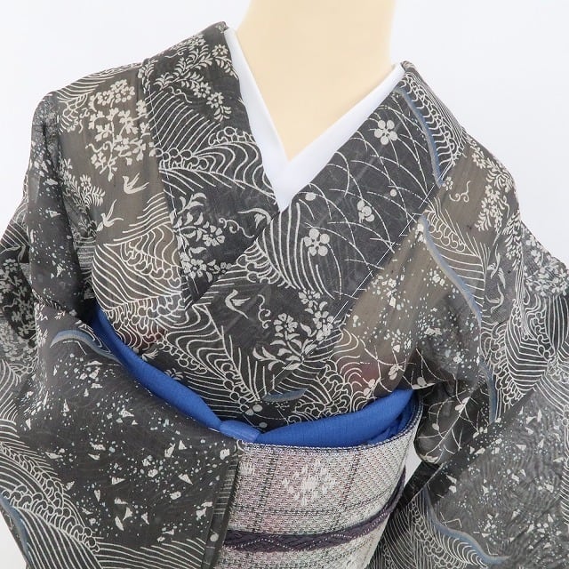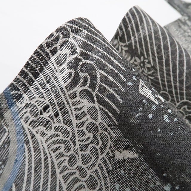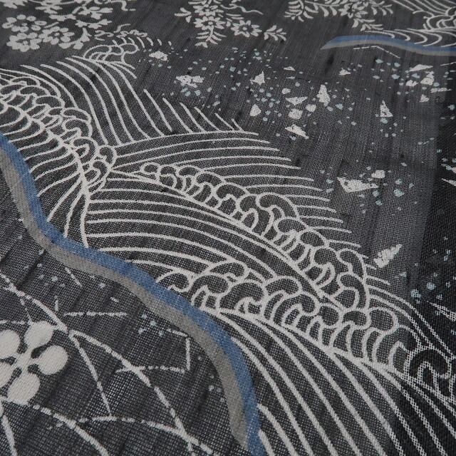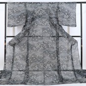 濃いグレーの色地全面に描き込まれた花と和柄の組み模様、紗の涼感に巧みな意匠が醸し出すこの上ない夏の涼味、それは正に“心癒す魅惑の香り”、高級絹糸が創り出す唯一無二の自然な風合いは正に夏芭蕉ならでは。