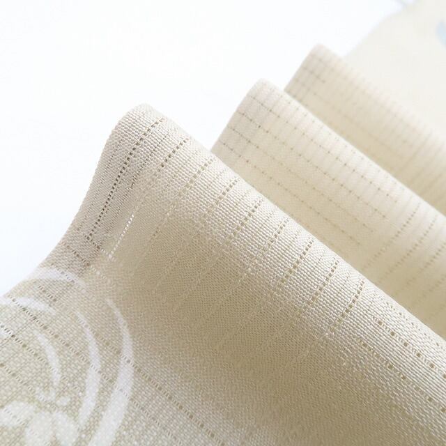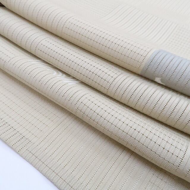 絽のお着物は、二本の経糸を捩りながら緯糸を織り込んだもじり織で、盛夏のお召し物として涼しげでさらりとした生地質が魅力、着る方にもまた見る方にも清らかな風を感じるような涼しさを届けてくれます。