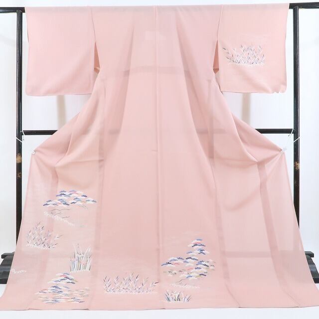 幻想的な飛沫を散らし時に平穏に時に勢いよく波打ちながら優しい紅梅色に染まる海原に吹く涼やかな風、晴れやかに色づいき活き活きと揺らめく松や笹、菖蒲が、視線を誘いながら袖を通す貴女を彩り、これから辿り着く慶びの場所に華を添える、“絽”手描き友禅お仕立て上がり品夏着物正絹トールサイズ仕付け糸付訪問着でございます。