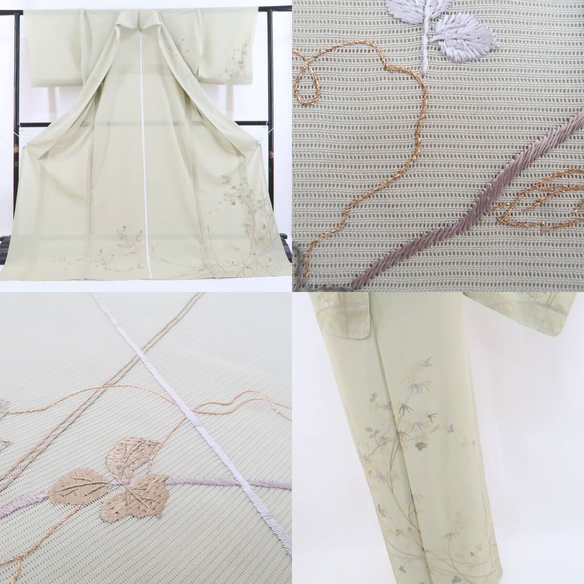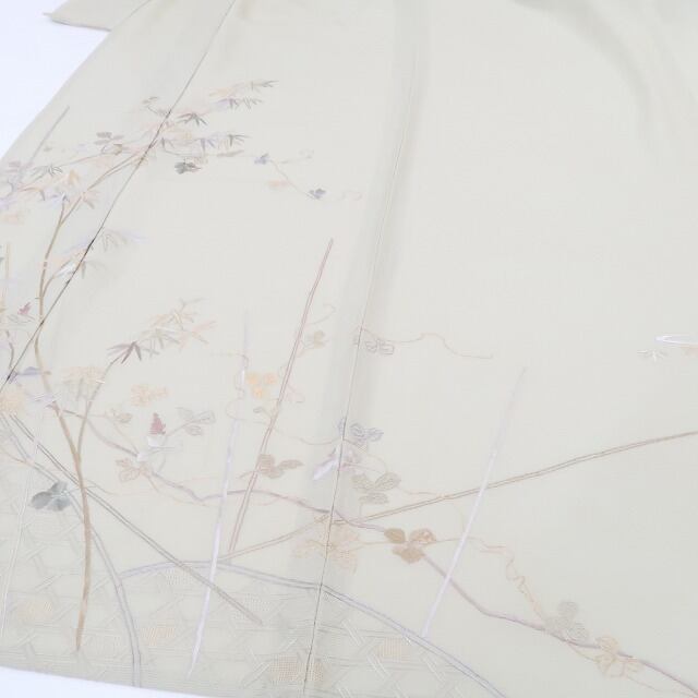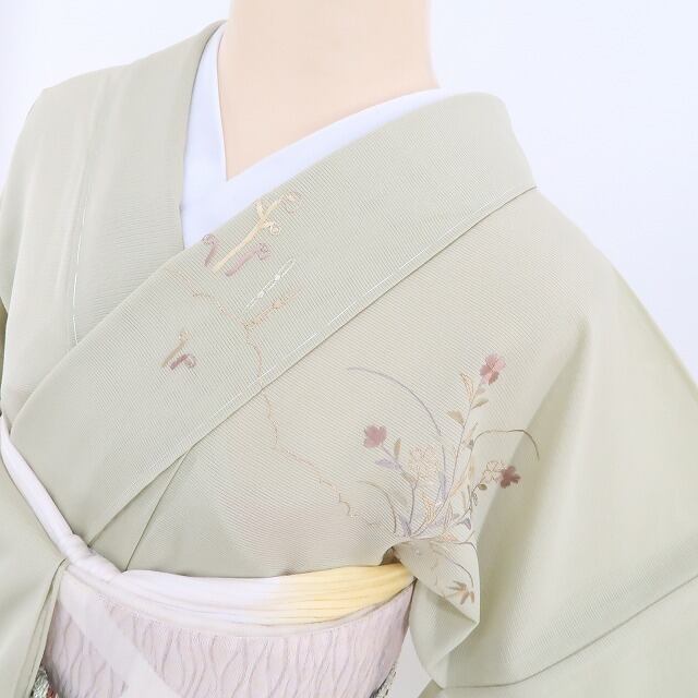 こちらのお着物は、ライトトーンの彩色で意匠の美しさにフォーカスしたデザイン性の高い刺繍を込めております。楚々として過飾にならず、さりげない大人のセンスを表現するのに最適なお召し物です。