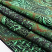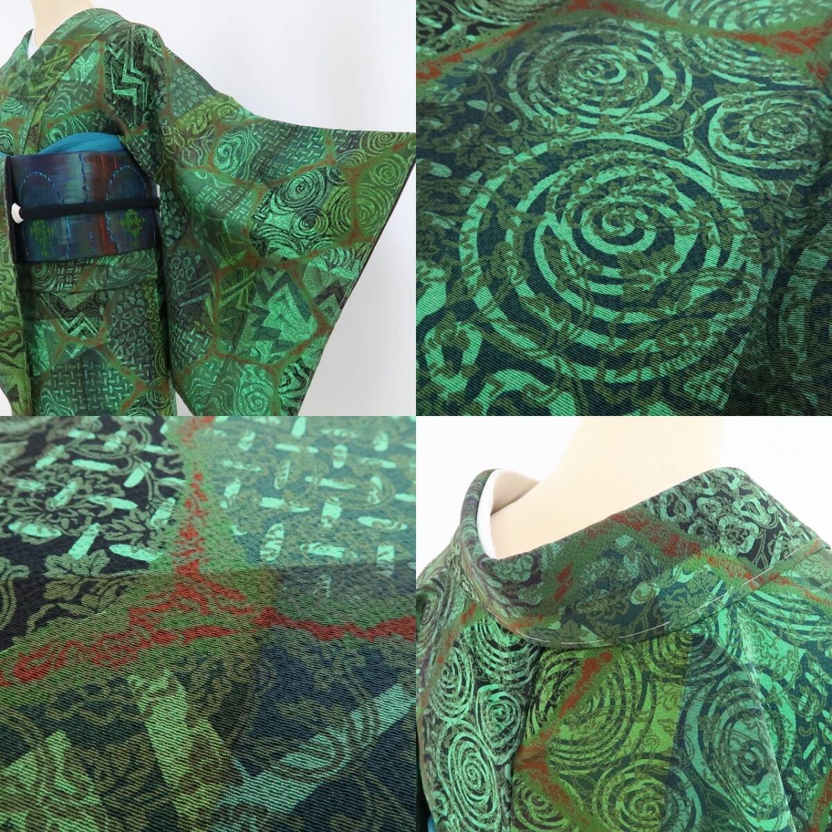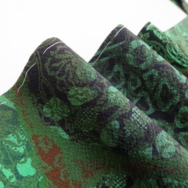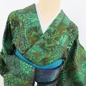 鮮やかな緑色の彩色で染め出された和の幻、それは豊かな温もりに深みの濃淡を描く前田仁仙の世界観、正に“更紗が誘ういと美しき染めのファンタジア”、何とも言えない独特の色合いが着物の奥行を一段と美しく際立たせています。