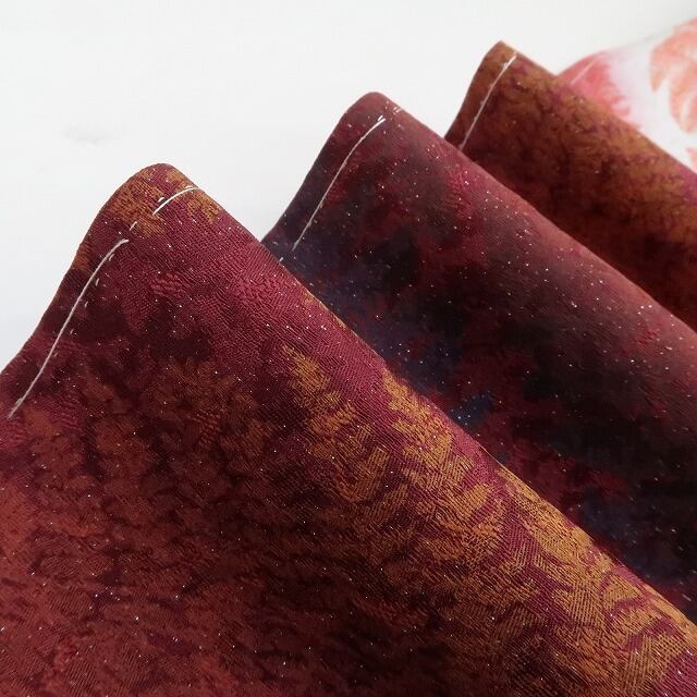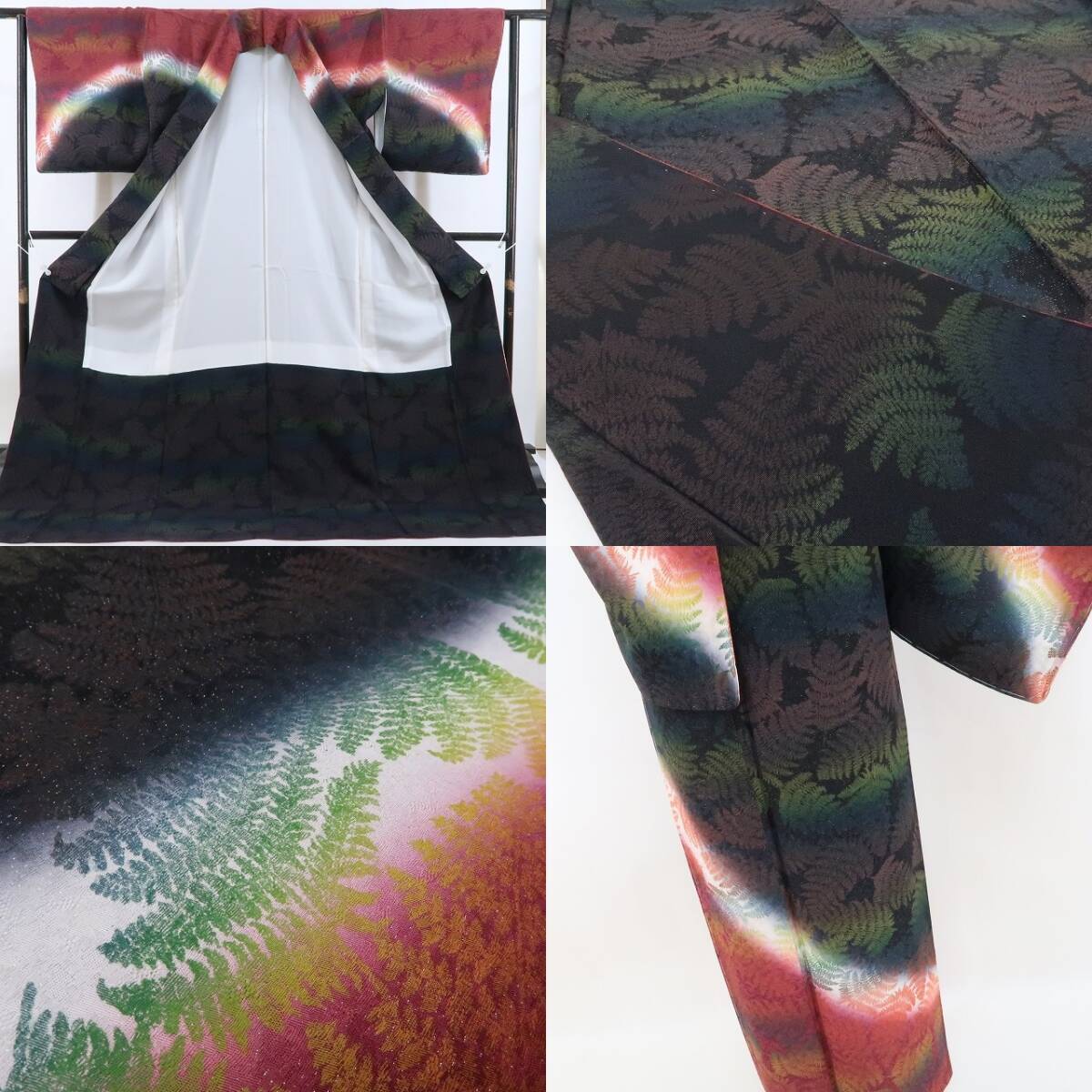 黒と中紅色の深みあるコントラストに艶めいて浮かび上がるシダの陰影、銀通しの重厚感に麗を奏でるその表情は正に“今をときめく創作着物の奥行”そのもの、さぁ!誰もが羨望の眼差しで見つめる美しい着姿…注目の的となること間違いなし。