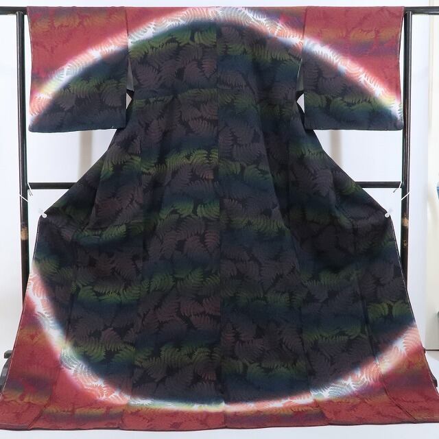 こちらのお着物は、ディープトーンの彩色で染めの美しさにフォーカスしたモダンなシダ柄を込めております。美しくも艶やかに…落ち着いた大人のセンスを表現するのに最適なお召し物です。