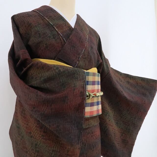 黒を基調に多彩ながら深みの彩色で染め出されたアブストラクトな創作デザイン、巧みな意匠に広がるこの上ない独創、それは豊かな感性が込められた仁仙着物への招待状、何とも言えない独特の色合いが着物の奥行を一段と美しく際立たせています。
