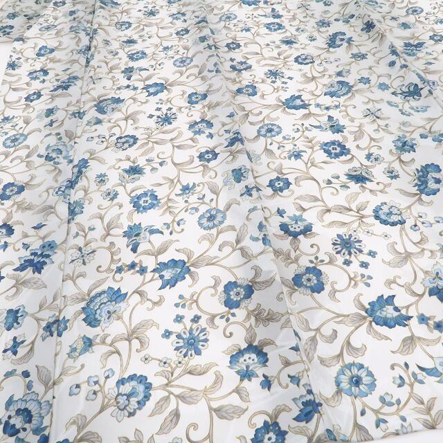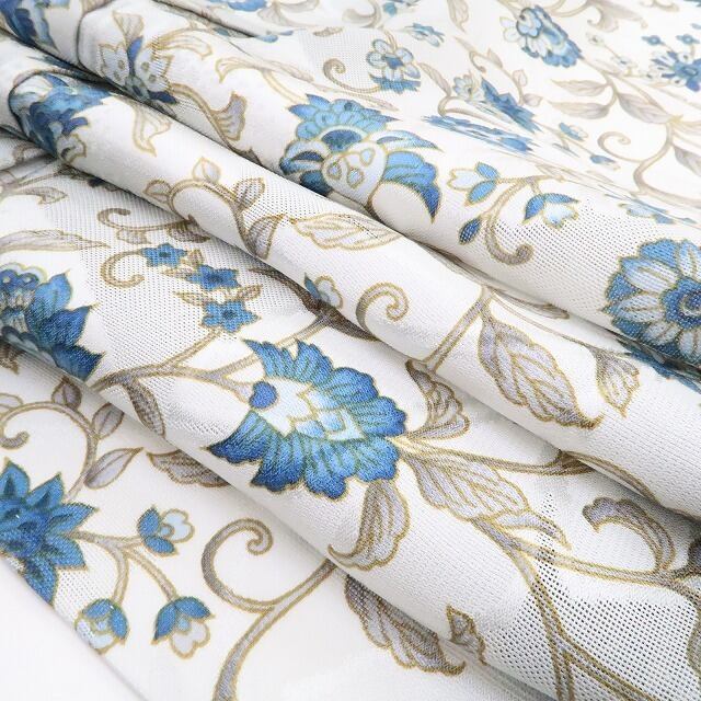 くるりと曲線美を描きながら上品な色に爽やかでいてどこか神秘的な色を差し、エレガントに薫り立つ唐花で敷き詰められた一面には、美しい透け感が影のように寄り添い、目にも涼しげで美しい更紗の風を吹かせてどこから見てもさり気なくも洒落味の高い夏姿へと続く、岡重“糊ぼかし友禅”紋紗お仕立て上がり品更紗夏着物仕付け糸付トールサイズ小紋です。