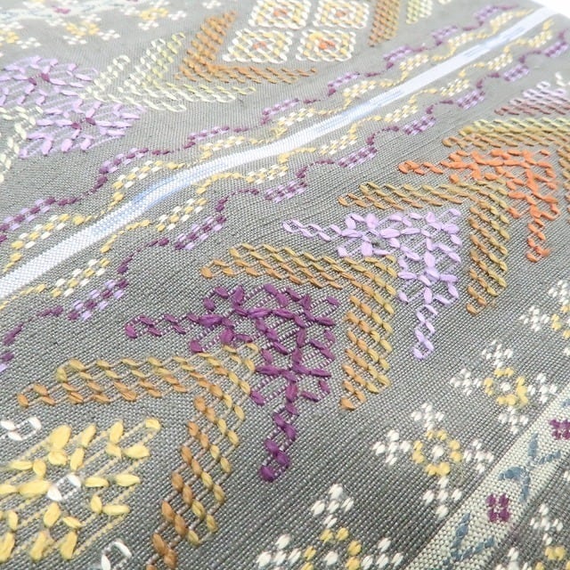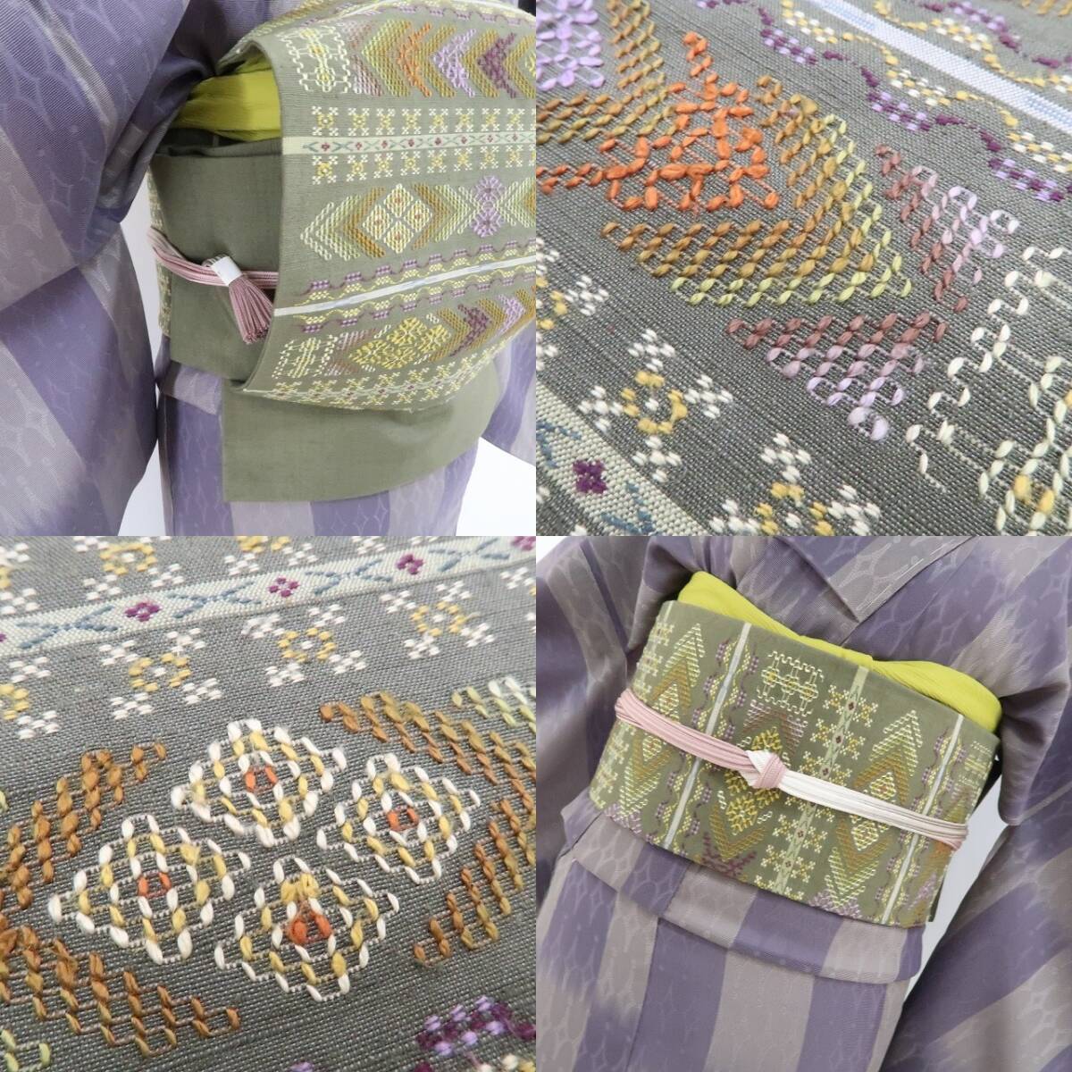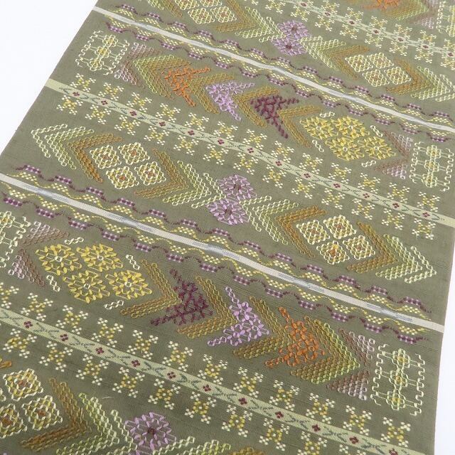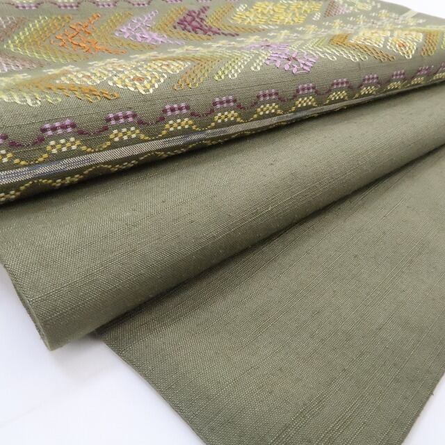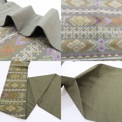 松葉色の落ち着きに浮かび上がる独特の文様がぱっと目を引く色使いと雰囲気で花開き、懐かしくもモダン、そして個性的なその魅力で妙なる織り技と意匠を物語り、一度目にし、きゅっと結んで味わう者を夢中にさせる独特の世界は、正に見て、着て楽しむ織物と言えるでしょう。