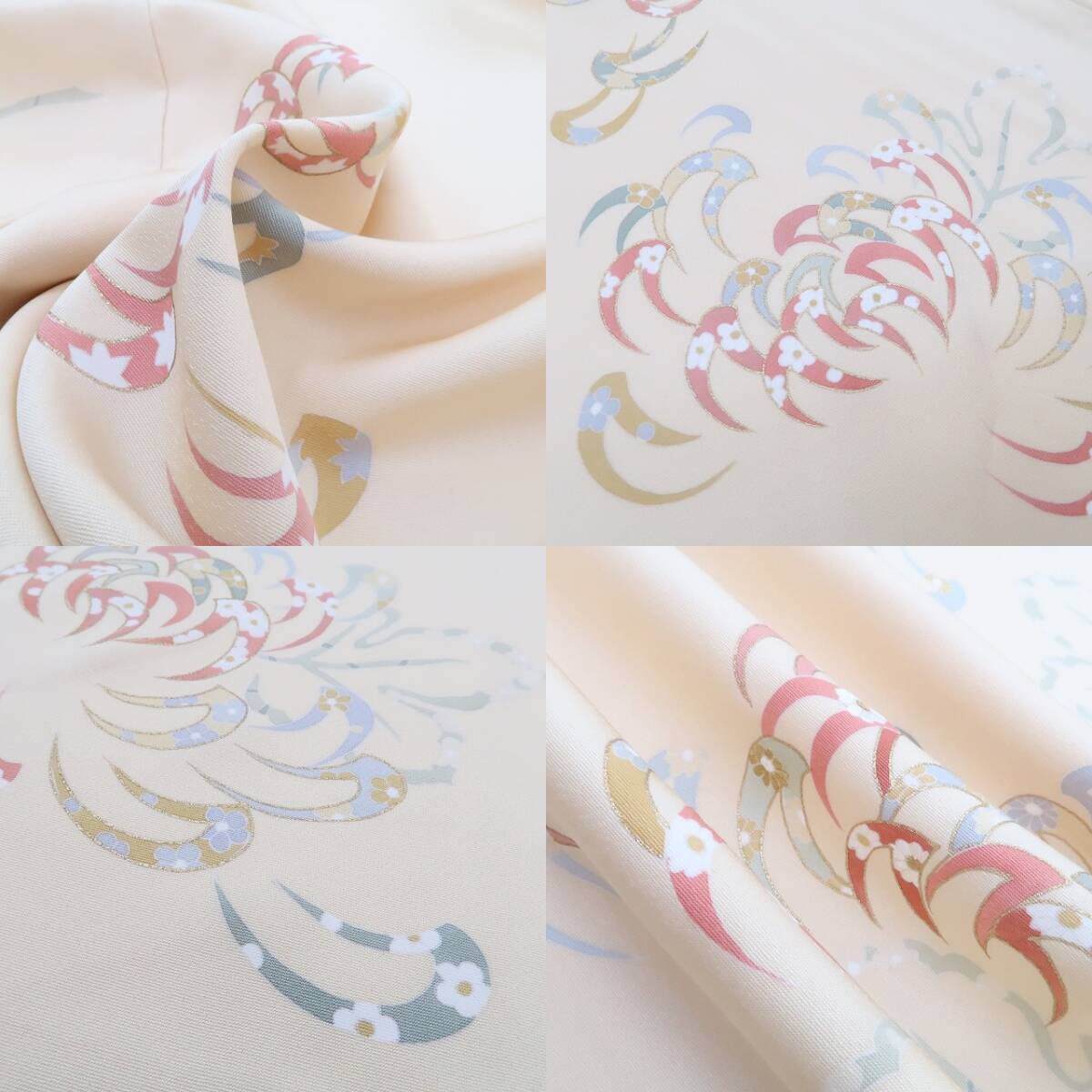 乱菊は、その名の通り菊の花びらが乱れて咲いている様子を描いたもの。歴史は古く平安時代から親しまれてきた日本を象徴する絵柄の一つで、邪気を払う長命の象徴とされています。デザイン化された柄は季節を問わず一年中着用することができます。