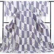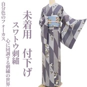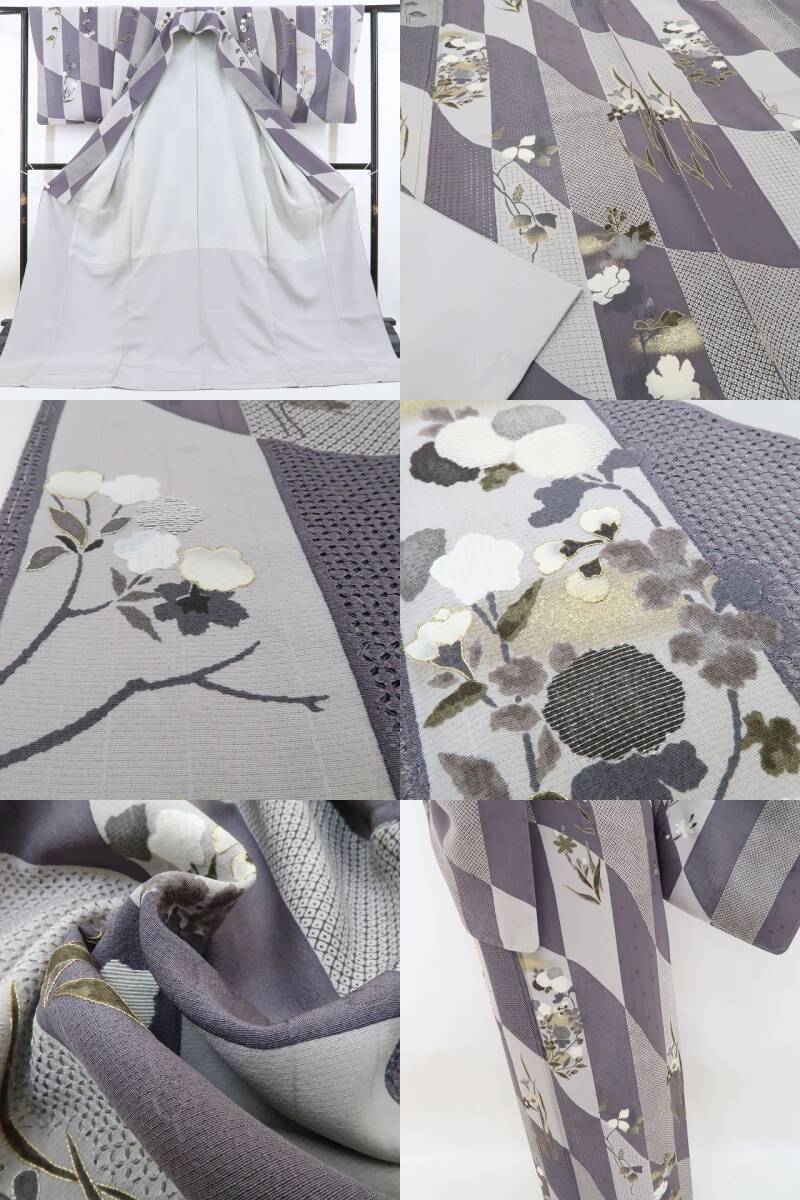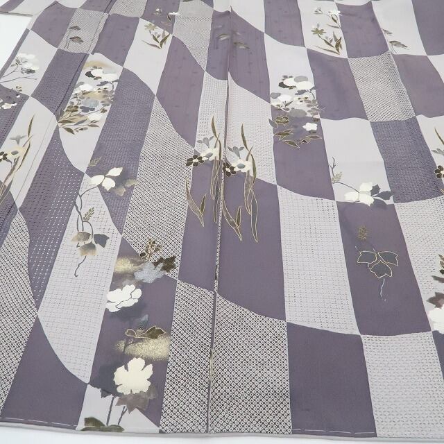 趣ある暁鼠色と深紫色の濃淡で描きこまれた不統一な格子模様、アシンメトリーな意匠が創り出す不思議な空間に巧みな構図で色を挿す花スワトウの艶刺繍、滑らかな正絹の風合いに聞こえてくる精美な刺繍の息遣い、それは正に“心に同調する刺繍の世界”、全体に醸し出されるこの上ないお洒落感は必見!さぁ、上質な着心地にセンスの良さを魅せて、素敵です。