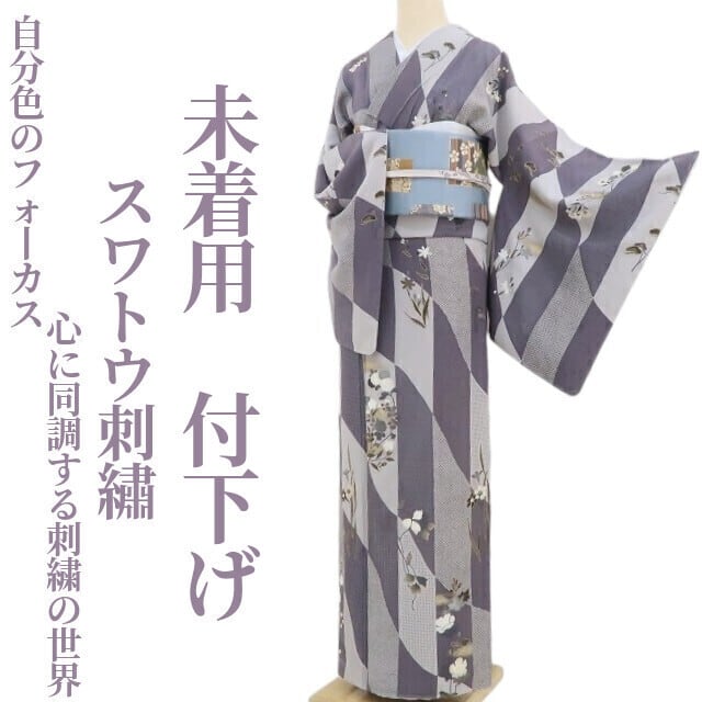 未着用 スワトウ刺繍 着物“自分色のフォーカス…心に同調する刺繍の世界”正絹 仕付け糸付 付下げ 4229