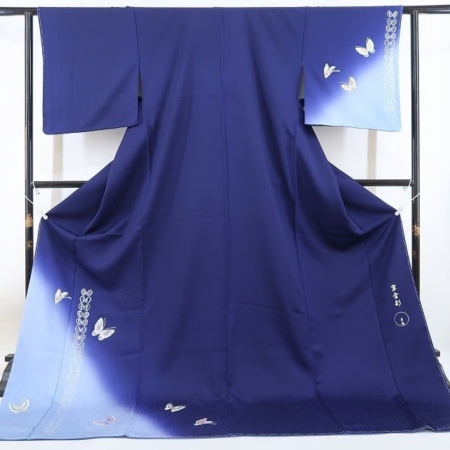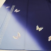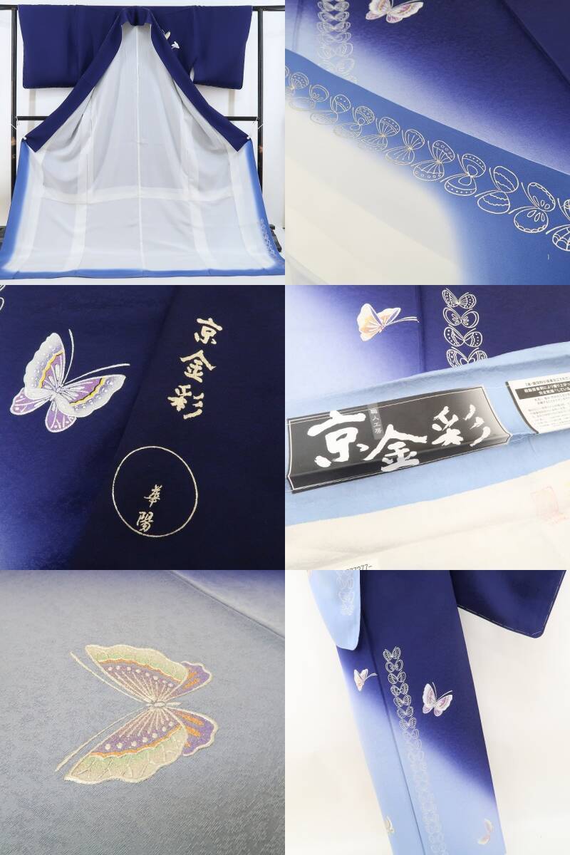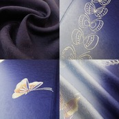 深みある鉄紺色の濃淡に艶めいて浮かび上がる怪しげな蝶のデザインモチーフ、それは金彩箔の煌めきに京金彩の光彩が照らし出す今をときめくモダンな色艶、正に“ひと夜に舞う蝶”…金彩友禅の技法が創り出す刺繍のような立体感、染とは違う独特の重厚感と豪華さがとても魅力的です。