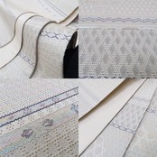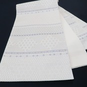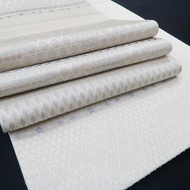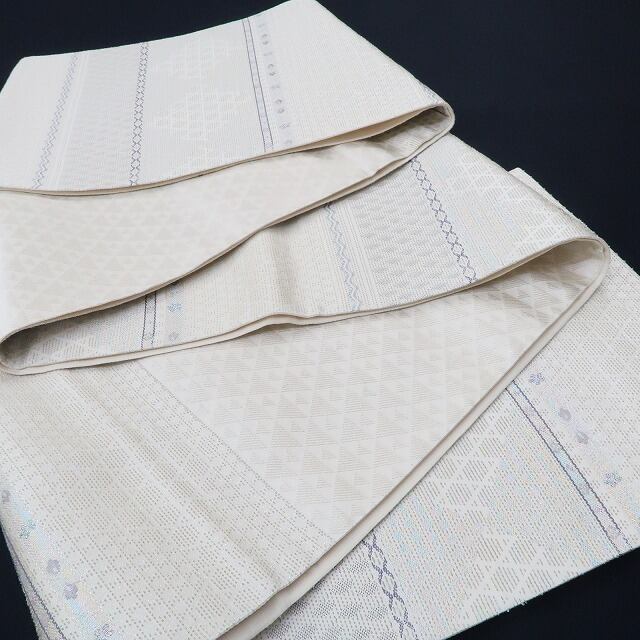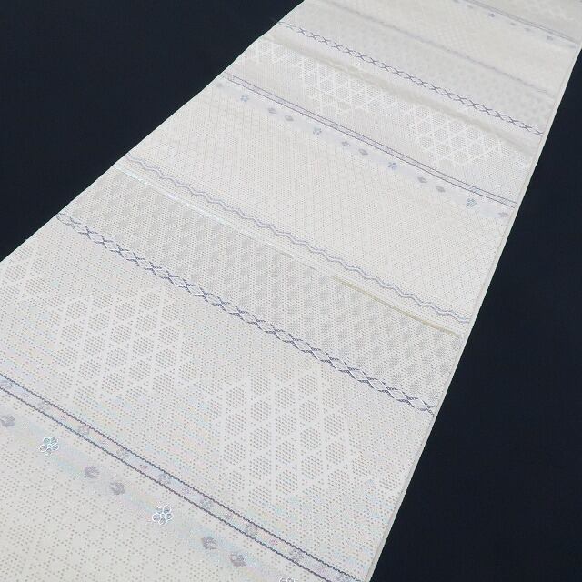 正絹素材のしなやかな質感に生成り色とシルバーの色糸が放つ滑らかな光沢、現代的な感性で横段状に織り出された花や和柄の組み模様、籠目や花菱のデザイン柄が醸し出す和を心得たモダンな色艶…醸し出される趣に誰をも惹きつけるこの帯の魅力が潜んでいます。