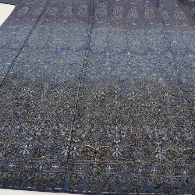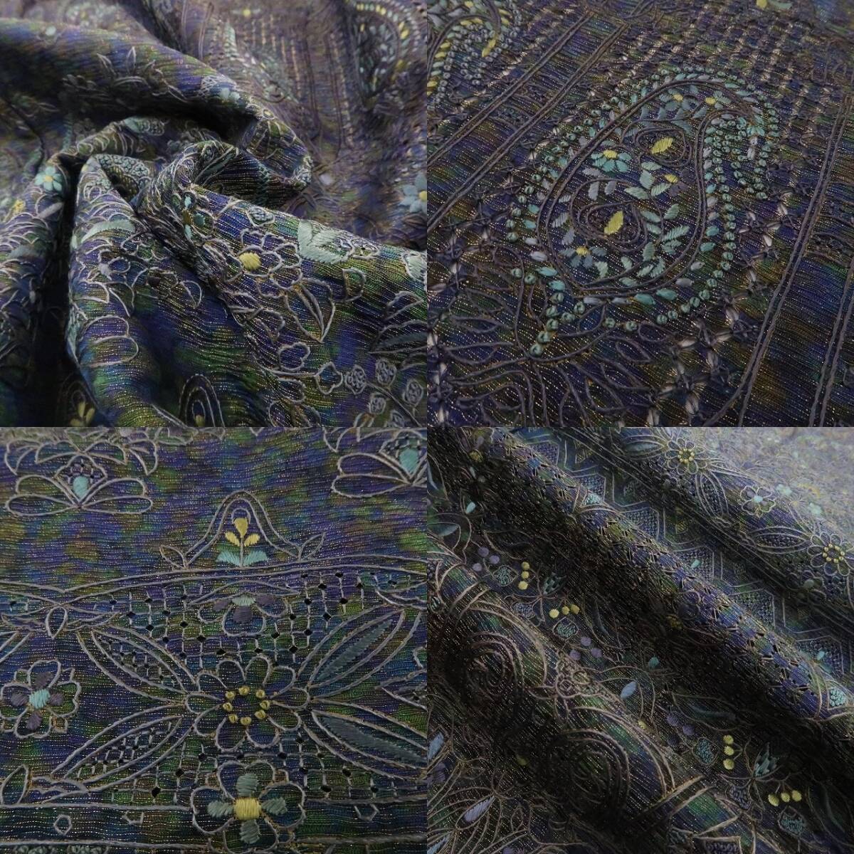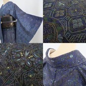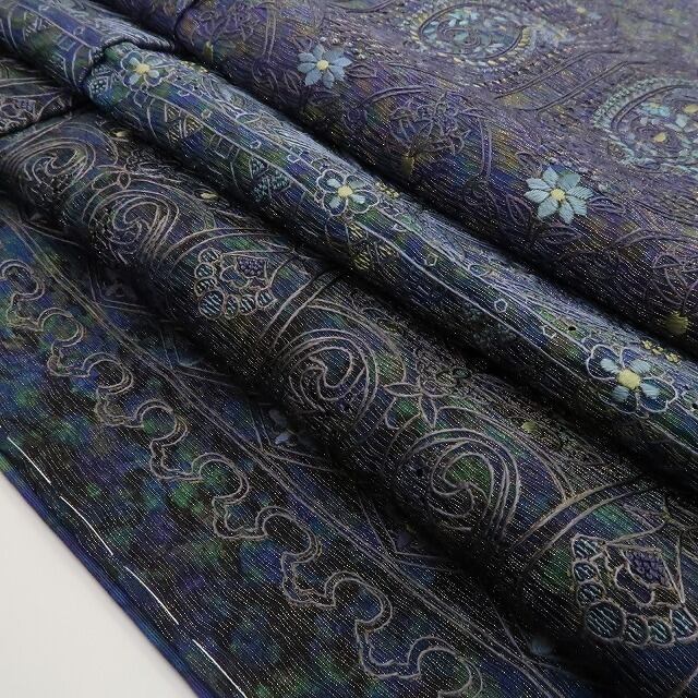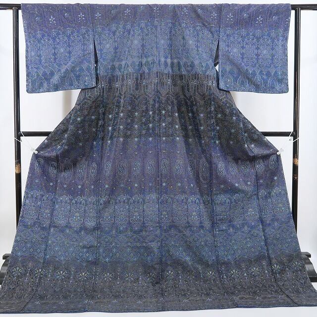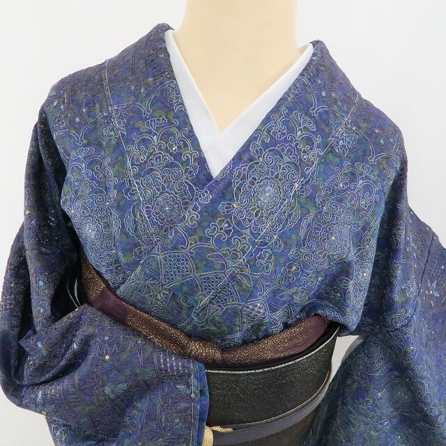 本紫色・紺青色など艶めいた濃淡が創り出す大人びた表情、金通しの重厚感に横段状の構図で浮かび上がる花や華文のデザインモチーフ、それは滑らかな正絹の地に細やかに縫い上げられた精微な刺繍の美しさ、総刺繍の贅なれども嫌みのない上品な艶…奥深い大人の装いがお楽しみいただける個性派着物です。