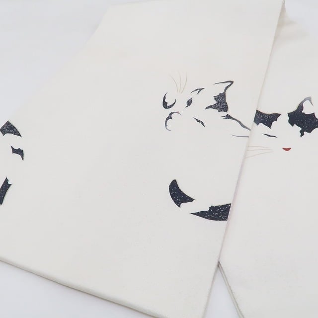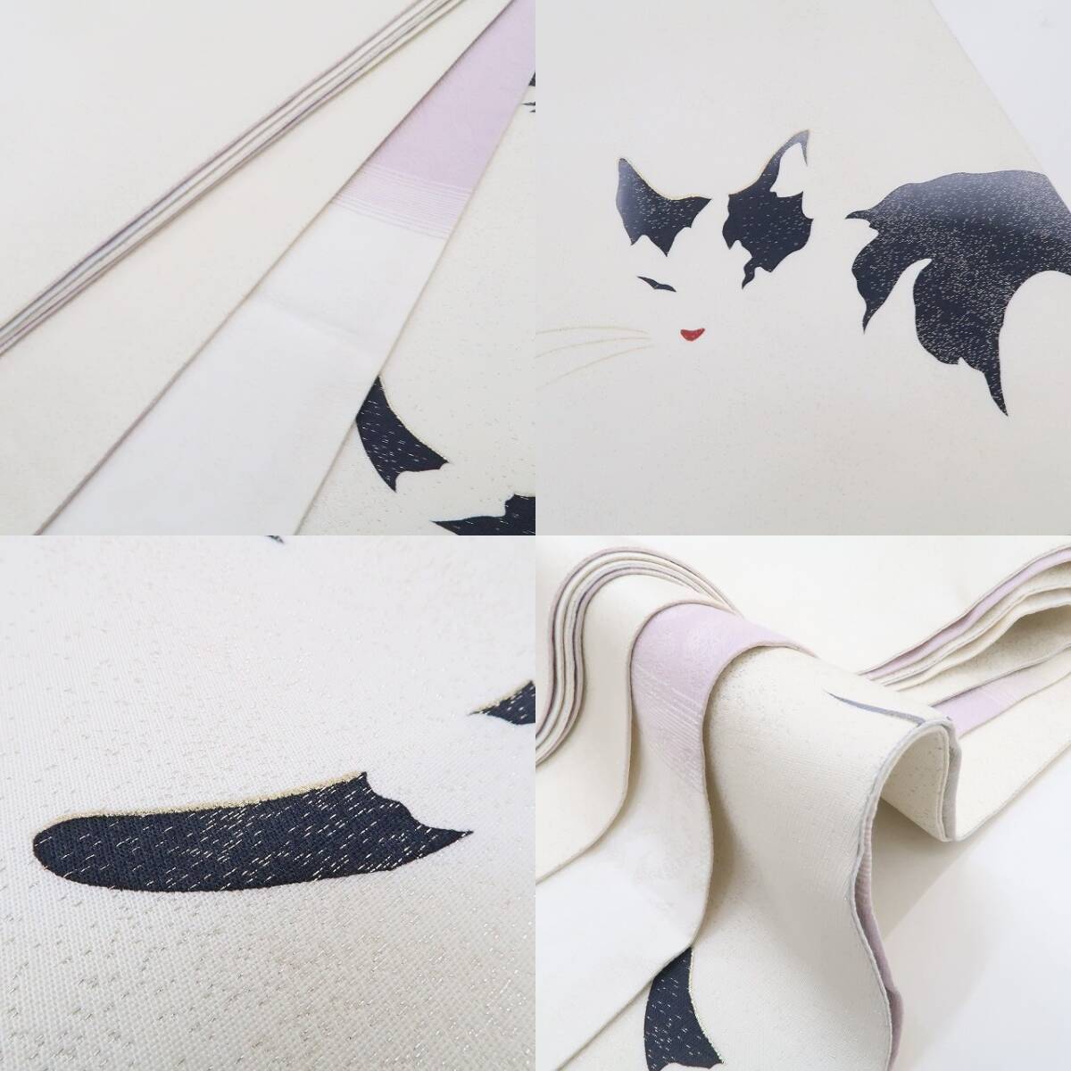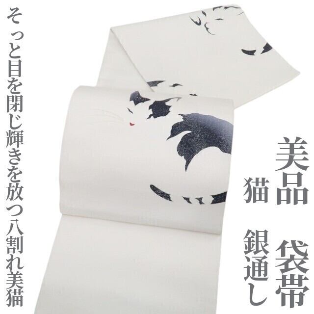 美品 猫 銀通し 着物 正絹“そっと目を閉じ、輝きを放つ八割れ美猫”袋帯 4275