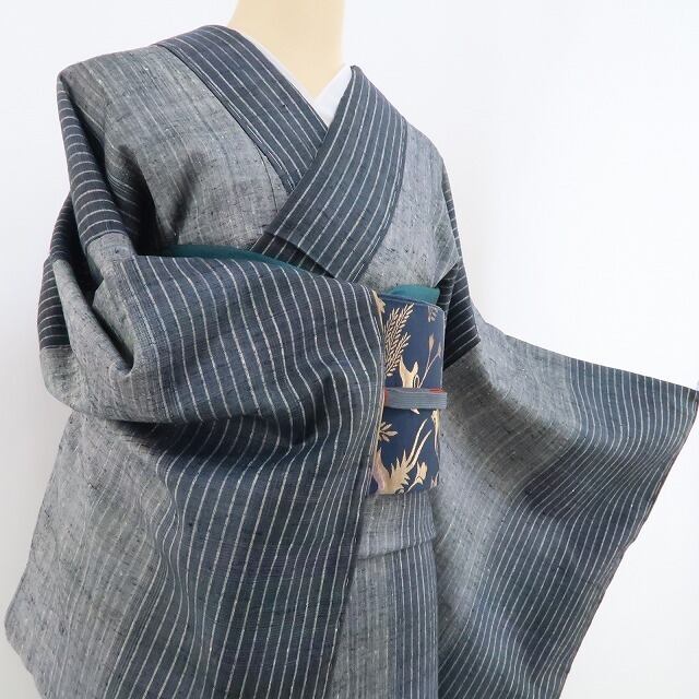 趣あるグレー(角度によって紫色の横縞が浮き出て見えます)の濃淡に引かれた精微な縦縞模様、シンプルながら民芸創作品ならではの豊かな温かみが魅力…それは正に“真綿紬に紡がれた手座繰りの真心”、季節の装いに…軽くしなやかな着心地と裾さばきに良さにきっとご満足いただけることでしょう。