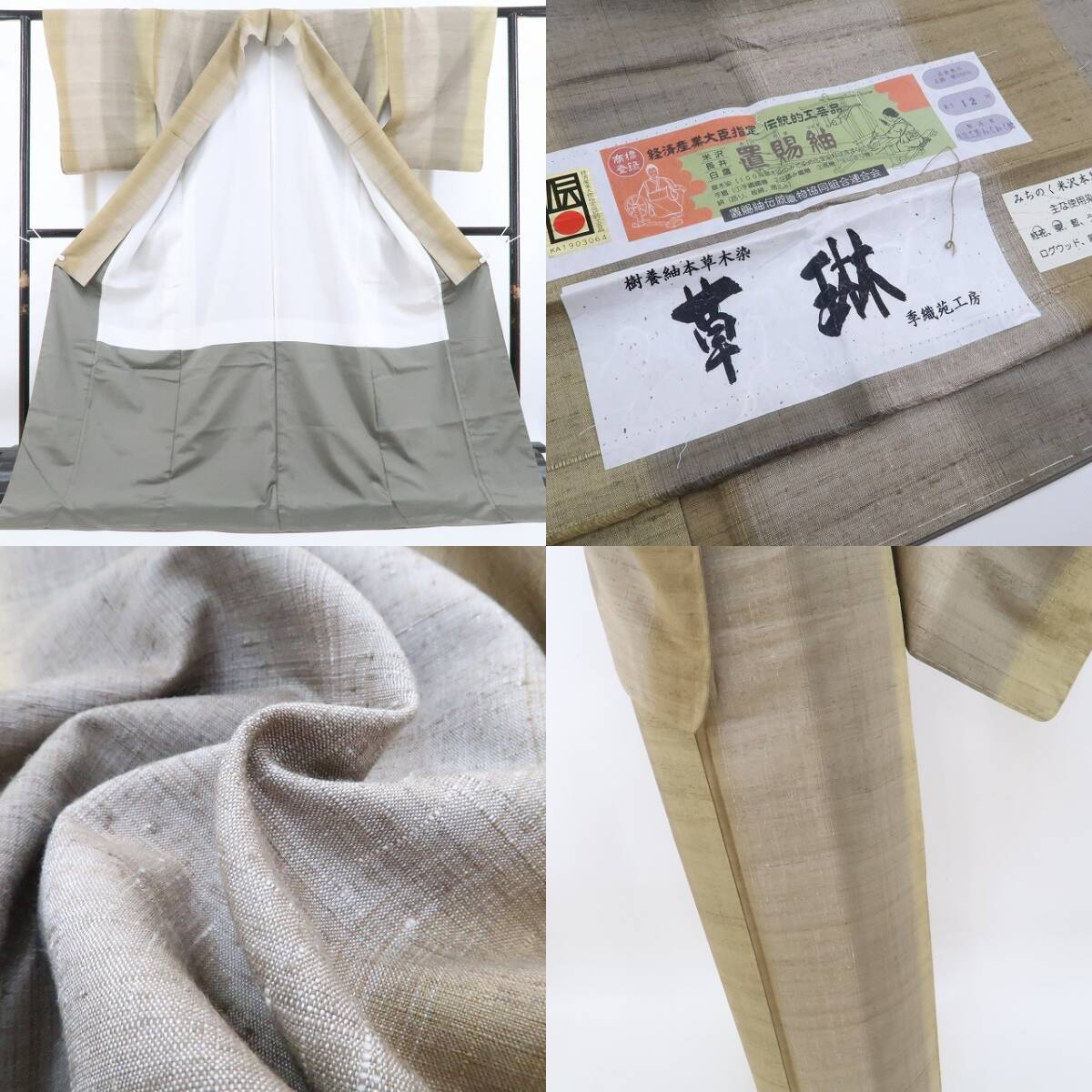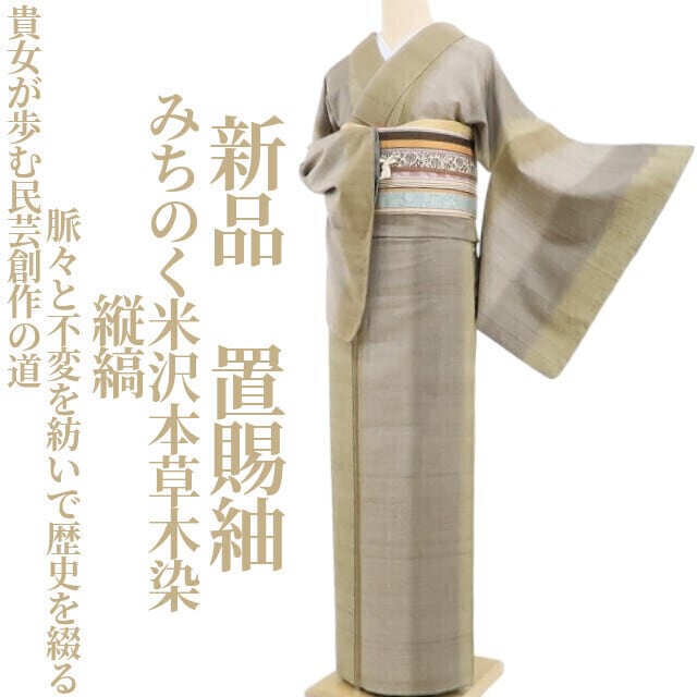新品 みちのく米沢本草木染 縦縞 着物“貴女が歩む民芸創作の道…脈々と不変を紡いで歴史を綴る”正絹 仕付け糸付 置賜紬 4284