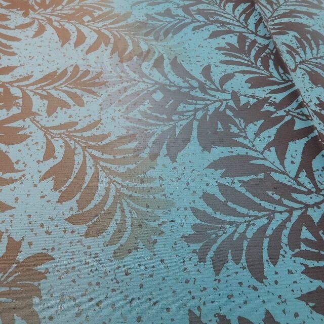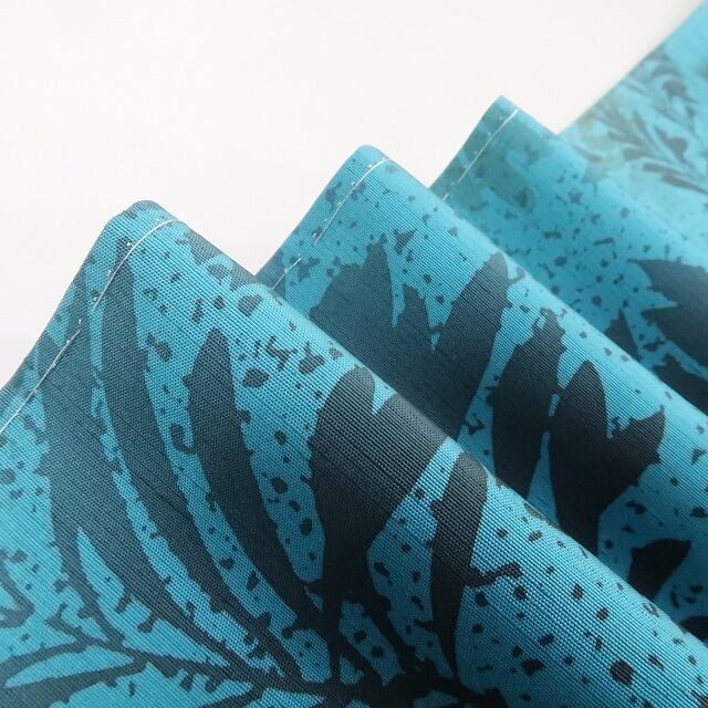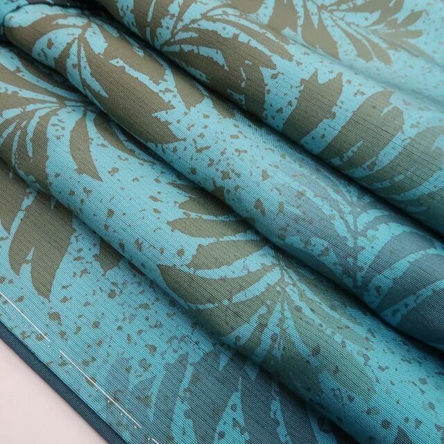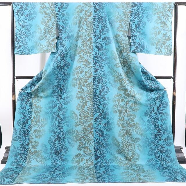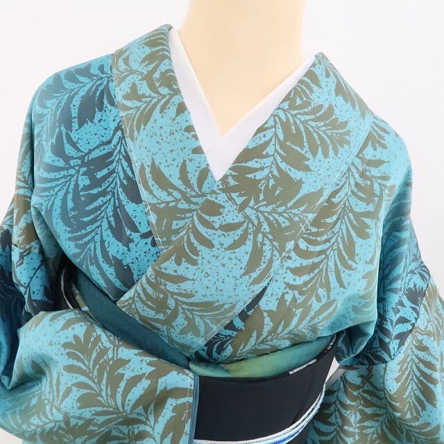 神秘的な浅葱色にあたたかな光が射し、影絵のようにざわざわ、ゆらゆら動き出し幻想を散らし、空も海も行ったり来たりする葉がシックでいてお洒落な正絹トールサイズ仕付け糸付小紋です。