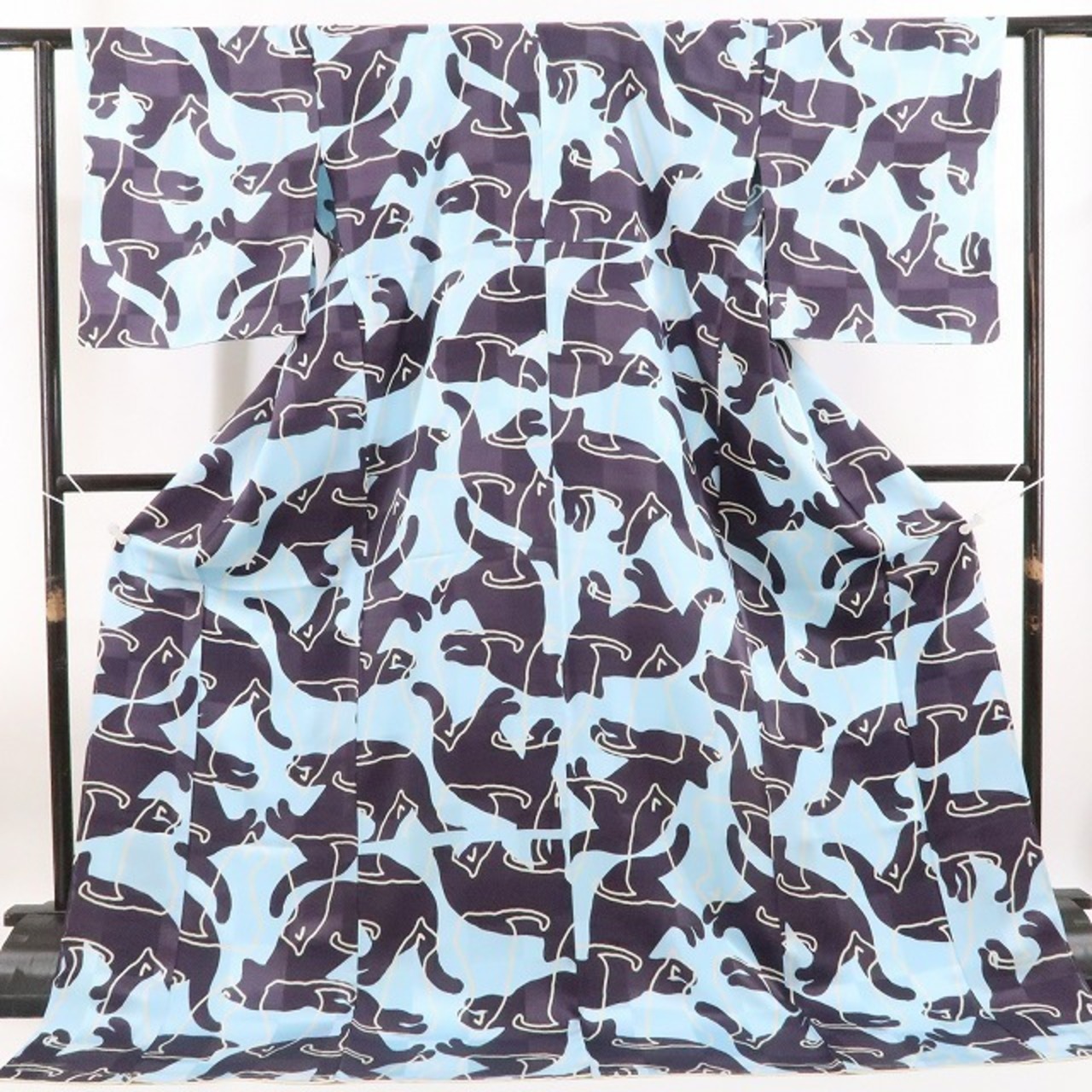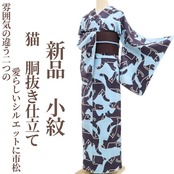 新品 猫 胴抜き仕立て 着物 正絹 仕付け糸付“雰囲気の違う二つの愛らしいシルエットに市松”小紋 4293