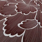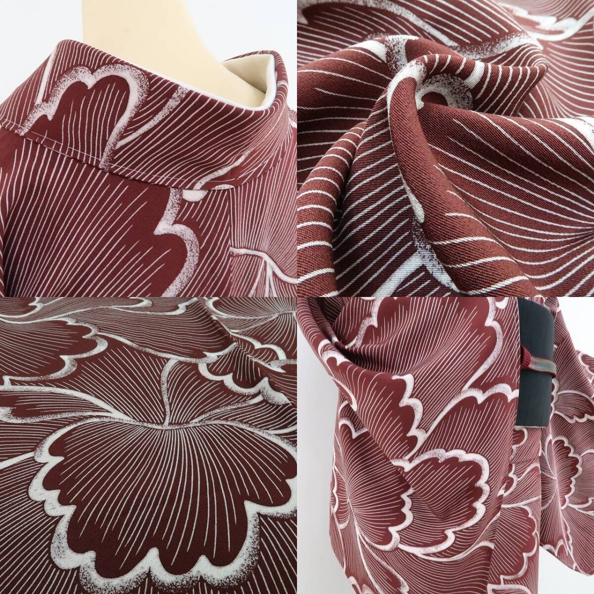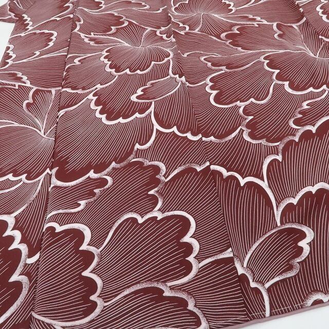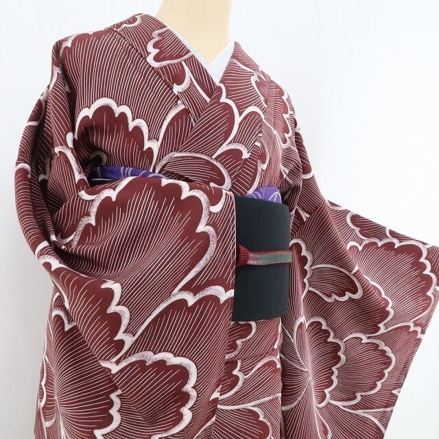 趣ある浅蘇芳色の地全面に描きこまれたデザイン花葉の繋ぎ模様、巧みな意匠が創り出す心地よい視覚のインパクト、それは正に創作小紋の粋な奥行…どこか親しみのある表情はお洒落小紋ならでは、モダンなタッチで描き込まれた柄行きが着物に艶を吹き込むかのような趣で美しい表情を奏でています。