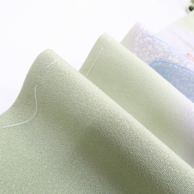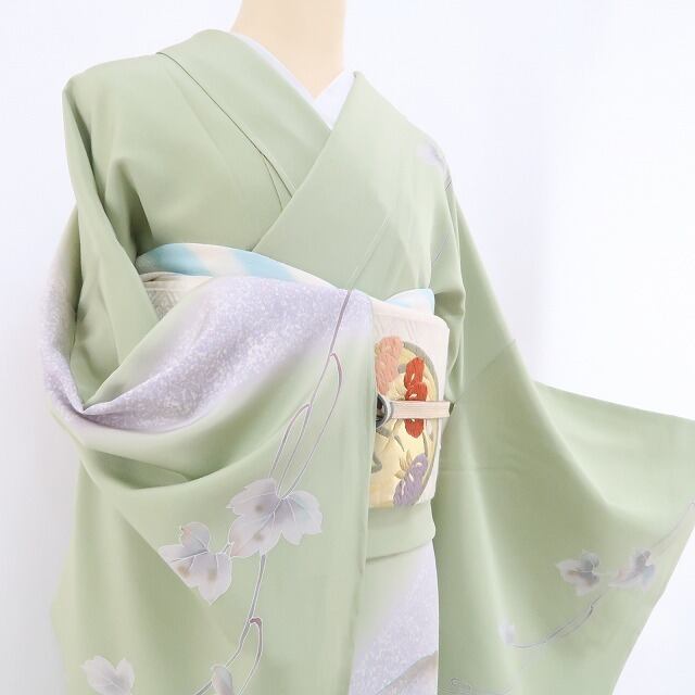 落ち着いた柳色の色地に巧みな構図で流線を描く柄行の濃淡、シンプルながら丁寧な染め技が創り出す和を心得た大人の色艶、左右バランスのとれた柄行きが着物に落ち着きを与え、大人びた着物の華がものの見事に表現されています。