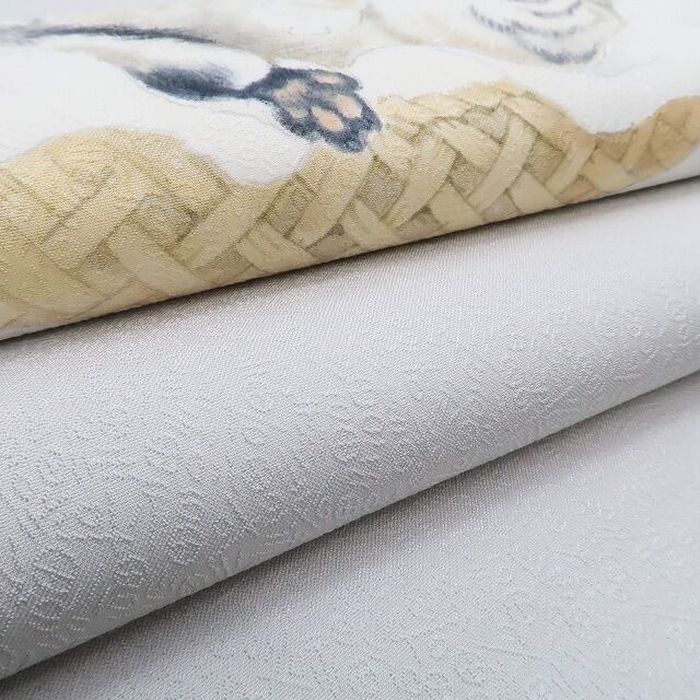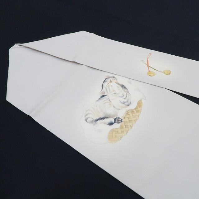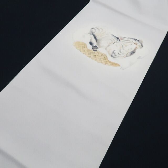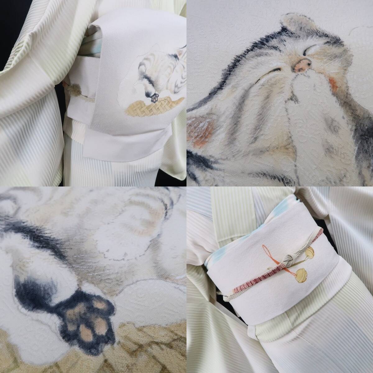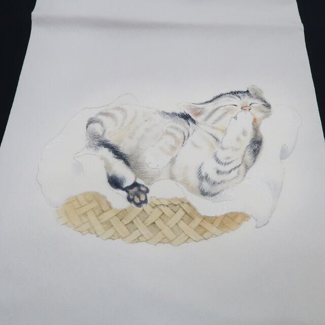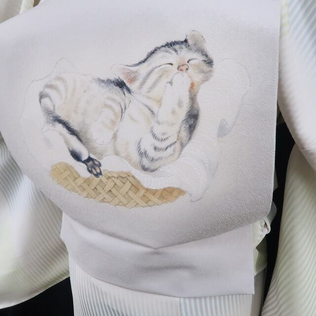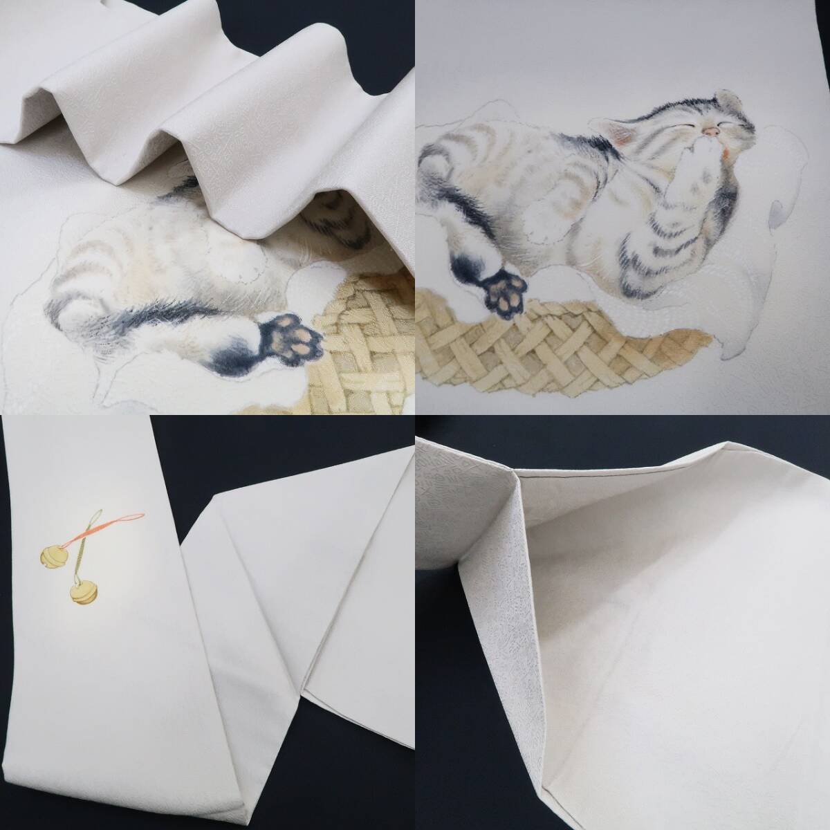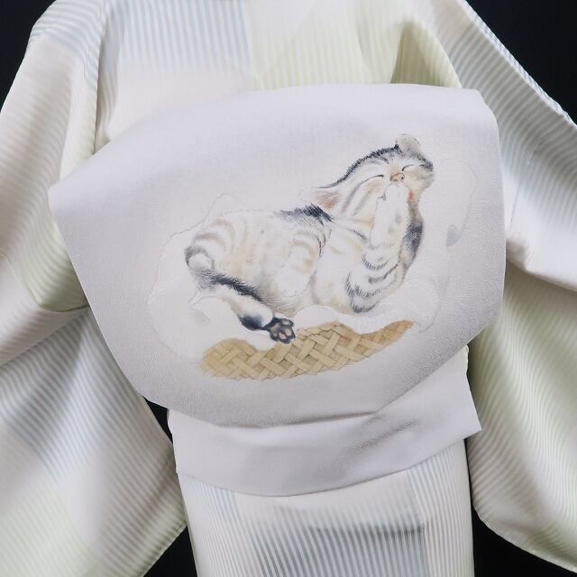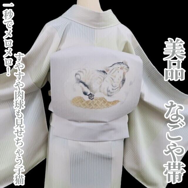 美品 着物 正絹“一秒でメロメロ...すやすや、肉球も見せちゃう子猫”なごや帯 4333