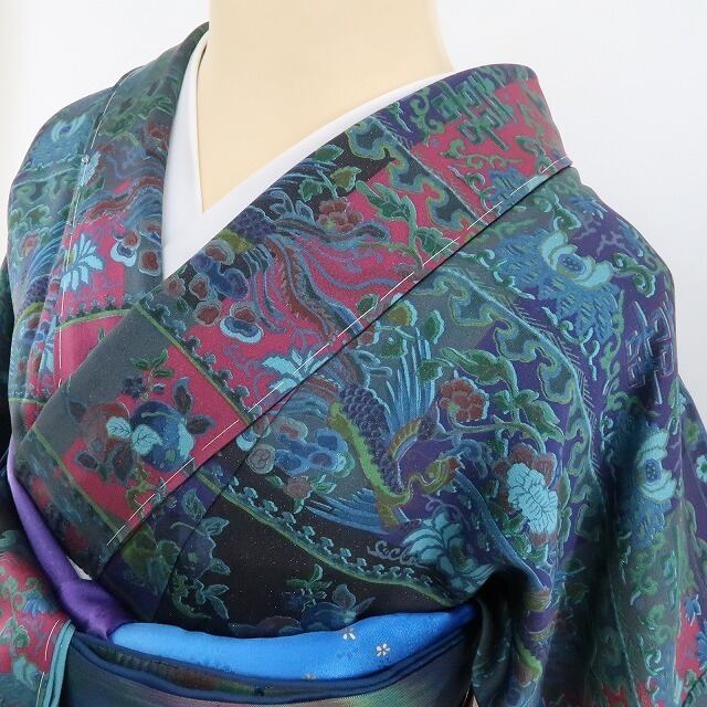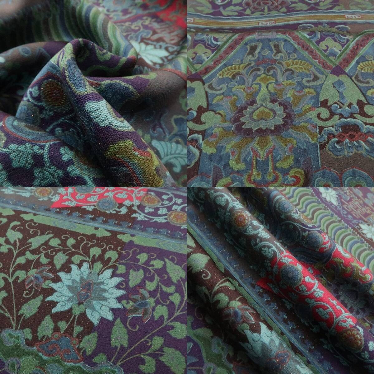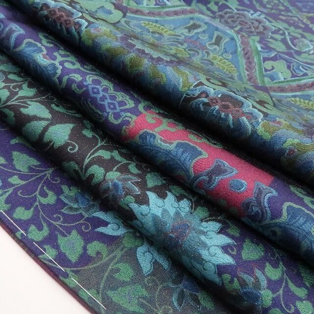 金通しの重厚感に多彩な彩りで染め出された花と華文のデザインモチーフ、横段状の構図に艶めくその表情は遥かを臨む大陸の風、それは正に更紗文様が誘ういと美しき着物の世界、巧みな意匠に更紗が照らす“記憶を標す夢の後先”、見事です。