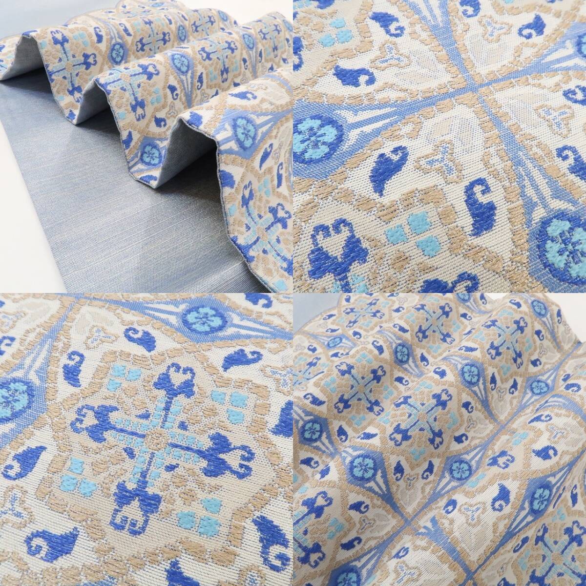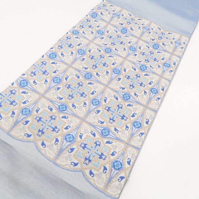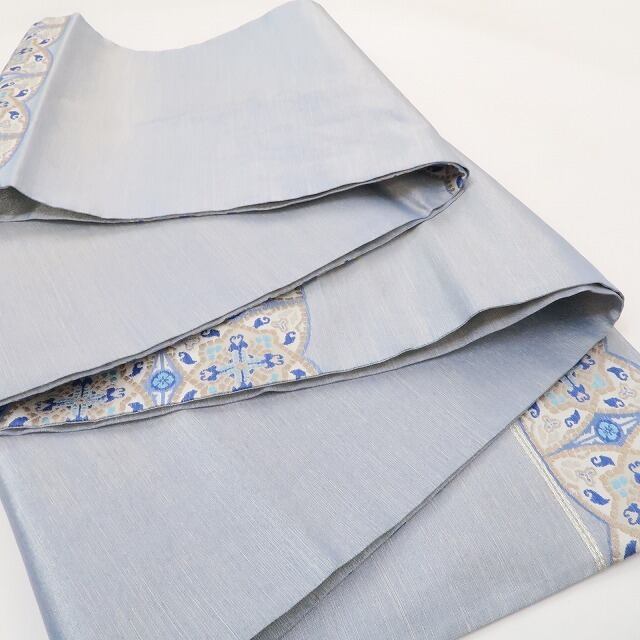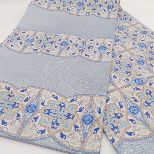 上品な薄縹色×ゴールドで織り成す一面には、堂々と構える七宝、その堂々たる姿に見入っていると星型の華文、勾玉や毘沙門亀甲、花菱が華やぎ違う表情を披露、見る角度を変えればさらに変化、和のひと時に楽しいおもてなしを用意するオリエンタル柄 を開く、誉田屋源兵衛ますいわ屋扱い“オリエンタル柄”正絹袋帯でございます。
