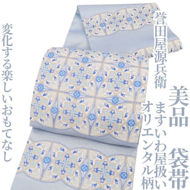 美品 誉田屋源兵衛 ますいわ屋扱い オリエンタル柄 着物 正絹“変化する楽しいおもてなし”袋帯 4369