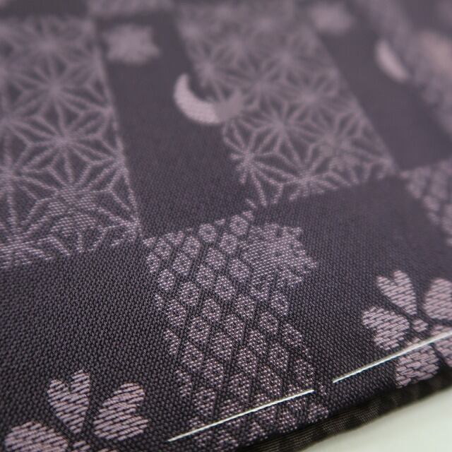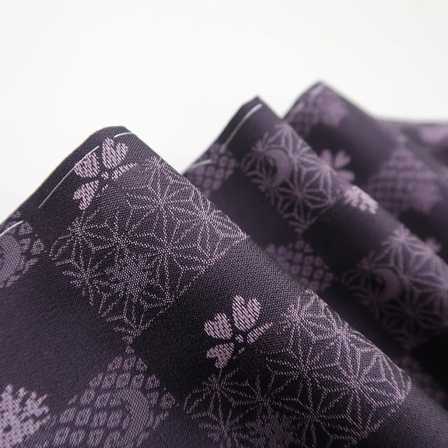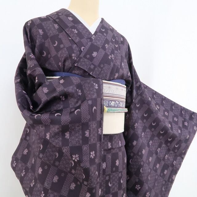 大人びた葡萄色の濃淡で格子を模るモダン市松の色模様、不統一に繋がれた洒落格子に花や和柄が醸し出すこの上ないお洒落感、それはモダンお召の粋な奥行、想屋工房が創り出す洗練の風…手くくり手摺り込みによる絣糸を一本一本合わせながら織り上げるお召の味わい、独特のしっとりとした風合いが着物の味わいを一段と馴染みやすい趣に変えています。