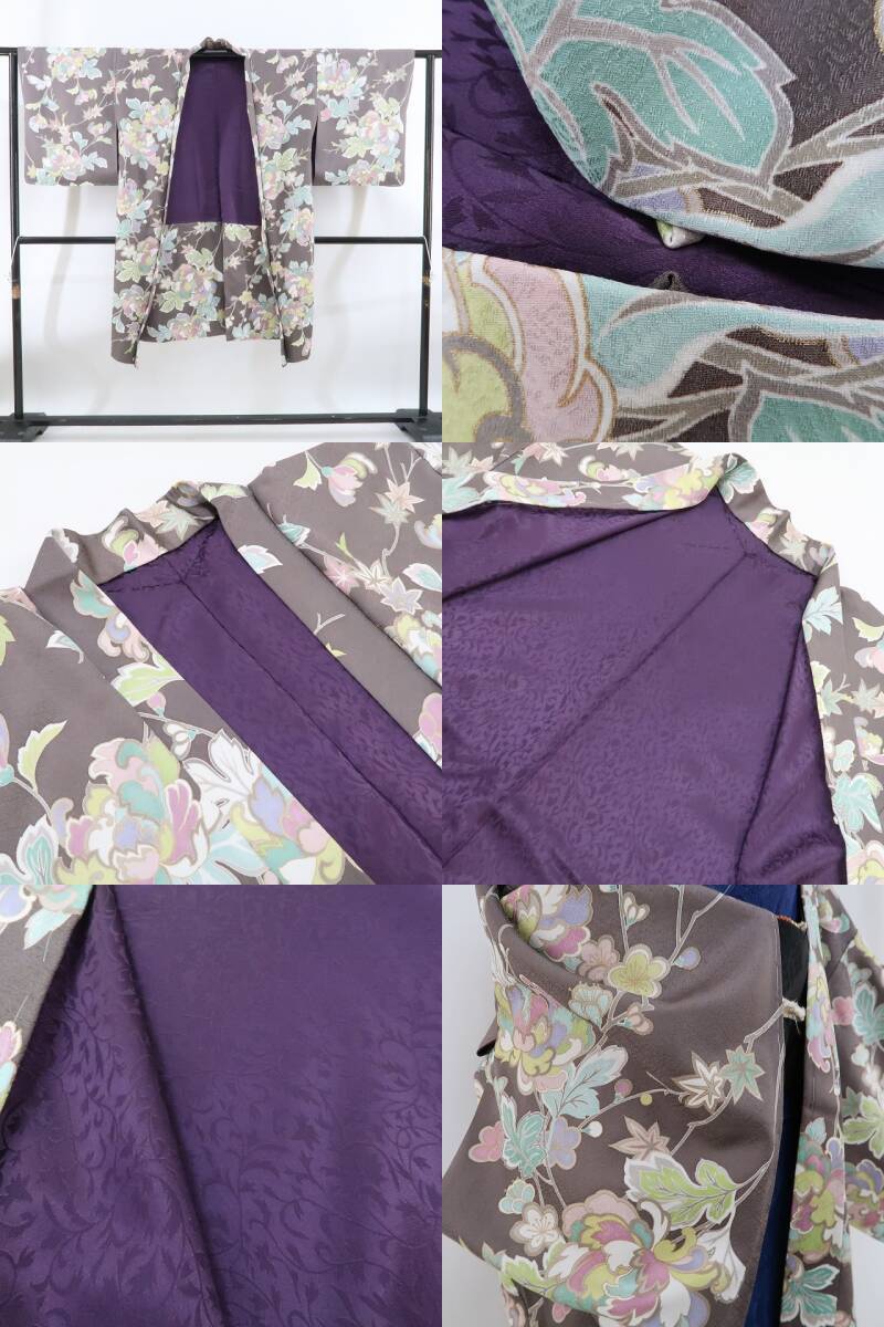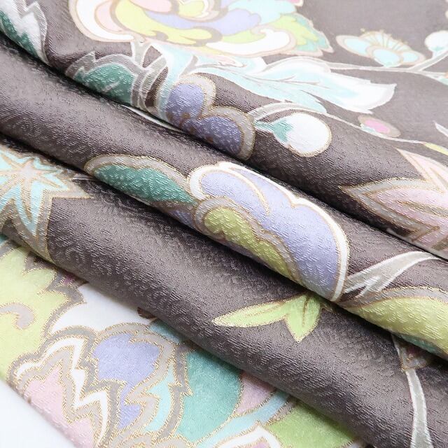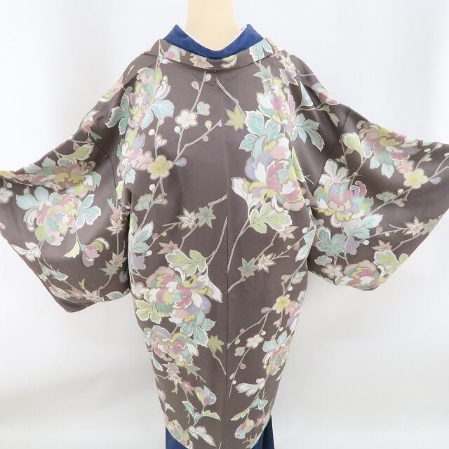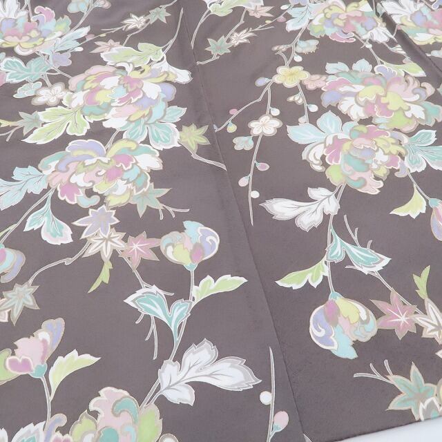 落ち着いた煤色の彩色に柔らかなシルエットを映す優美な花のデザインモチーフ、“牡丹・紅葉・梅”の花柄が誘う和を心得た季節の潤い、意匠に醸し出されるえも言われぬお洒落感は必見の価値あり!正絹のしっとりとした艶が和の潤いを一段と美しく際立たせています。