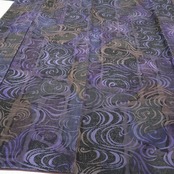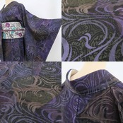 黒に本紫色等で解かれ、渦巻き曲線を描き、視線を惑わせながら力強くもゆったりと鼓動を響かせる流水は、その独特の色使いと共に静かに静かにもう一つの柄を宿し、まるで不思議な水面に映るもう一つの不思議な世界を見ているかのような、前田仁仙 落款“流水”正絹仕付け糸付トールサイズ小紋でございます。