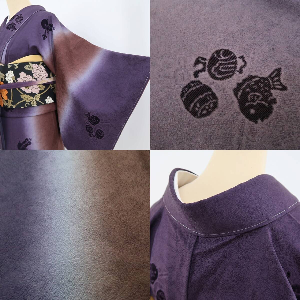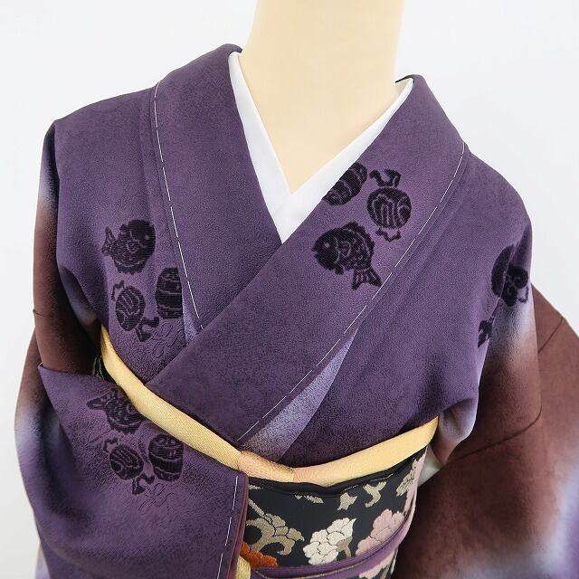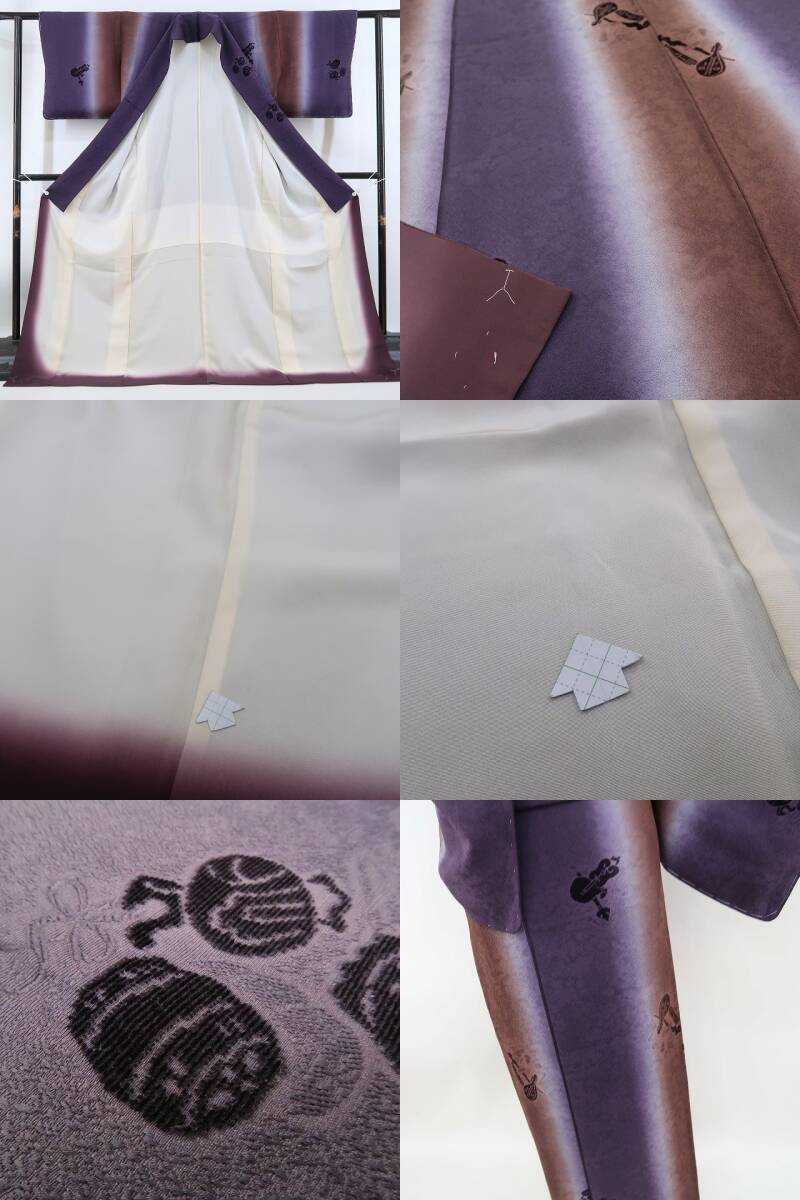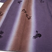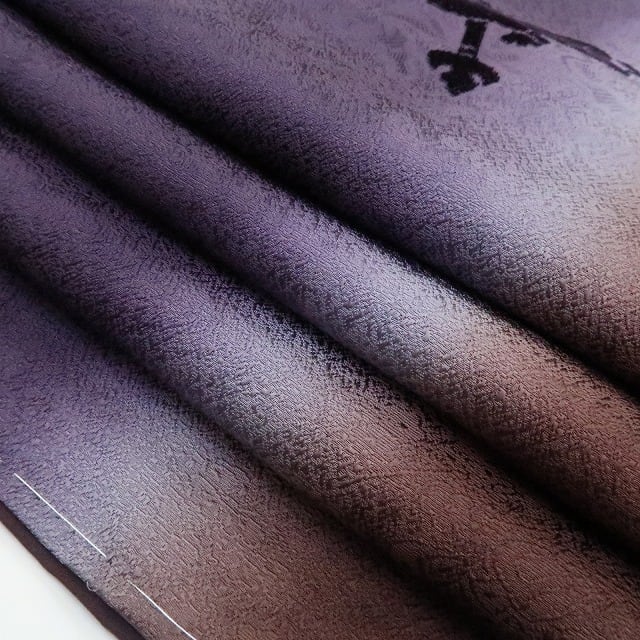 丸みある葡萄色と赤褐色の彩色に広がるこの上ない温もり、それは縦状の構図に暈しの濃淡が創り出すお洒落小紋の粋な奥行、全面に散りばめられた縁起小柄の愛らしい表情は必見!どこか親しみのある表情は小紋ならでは、モダンなタッチで描き込まれた色柄が着物に艶を吹き込むかのような趣で美しい表情を奏でています。