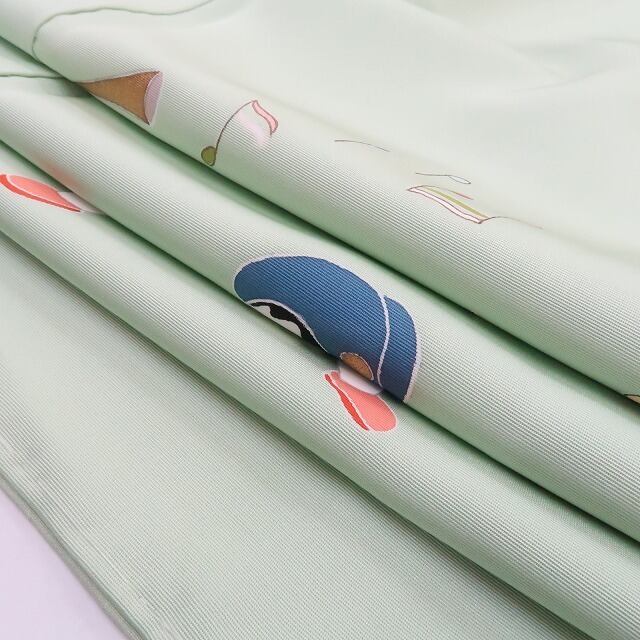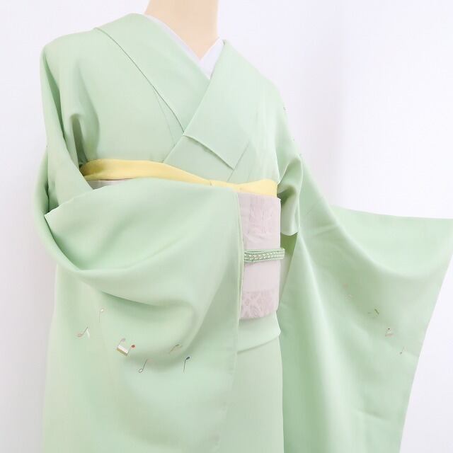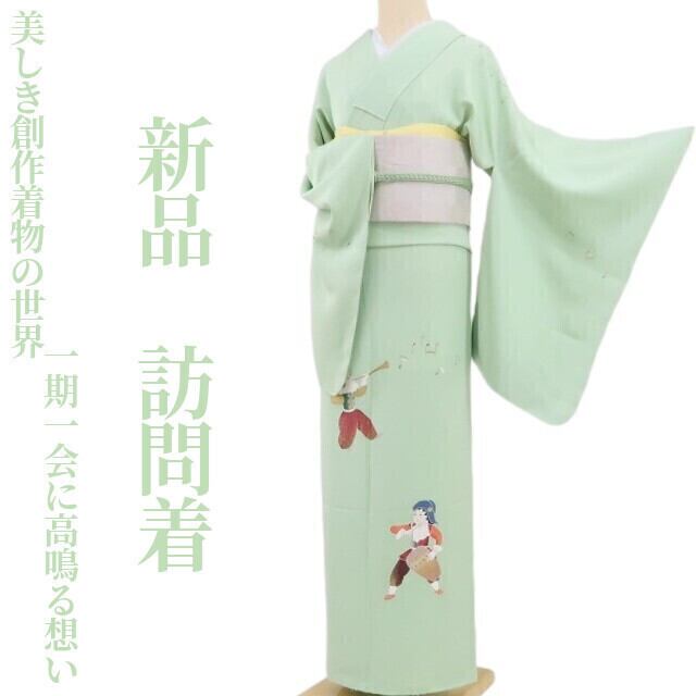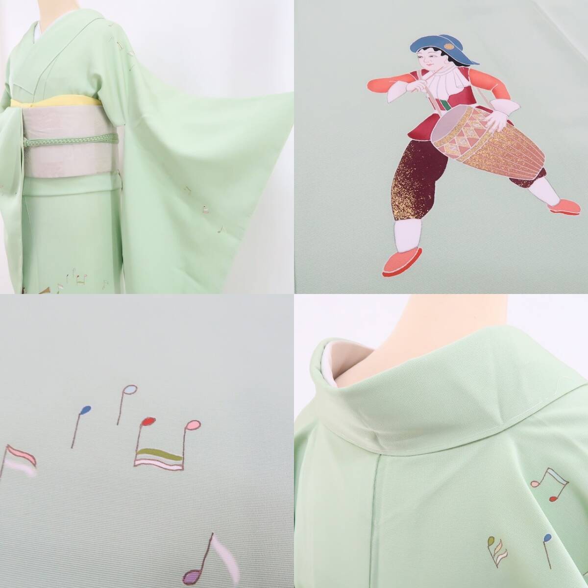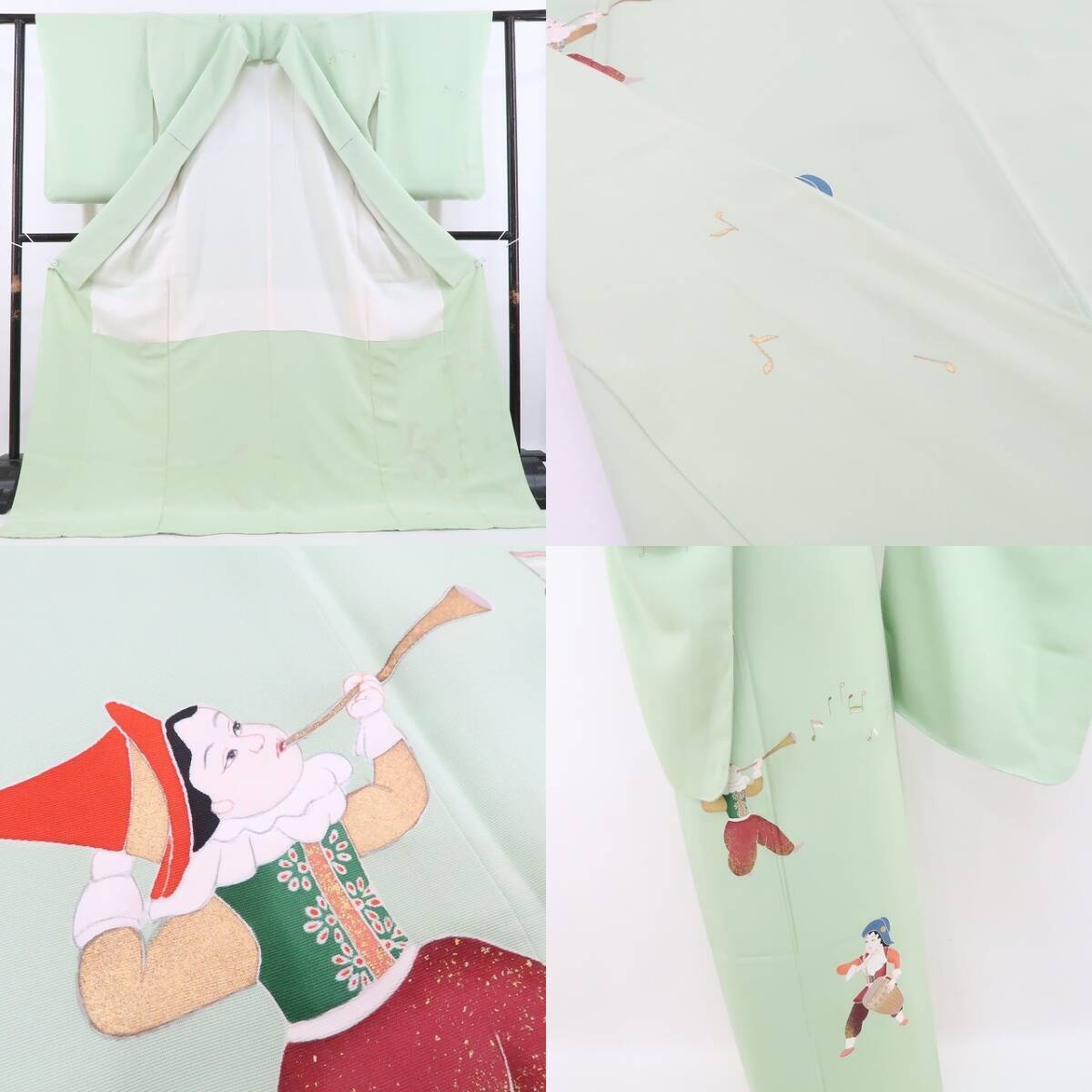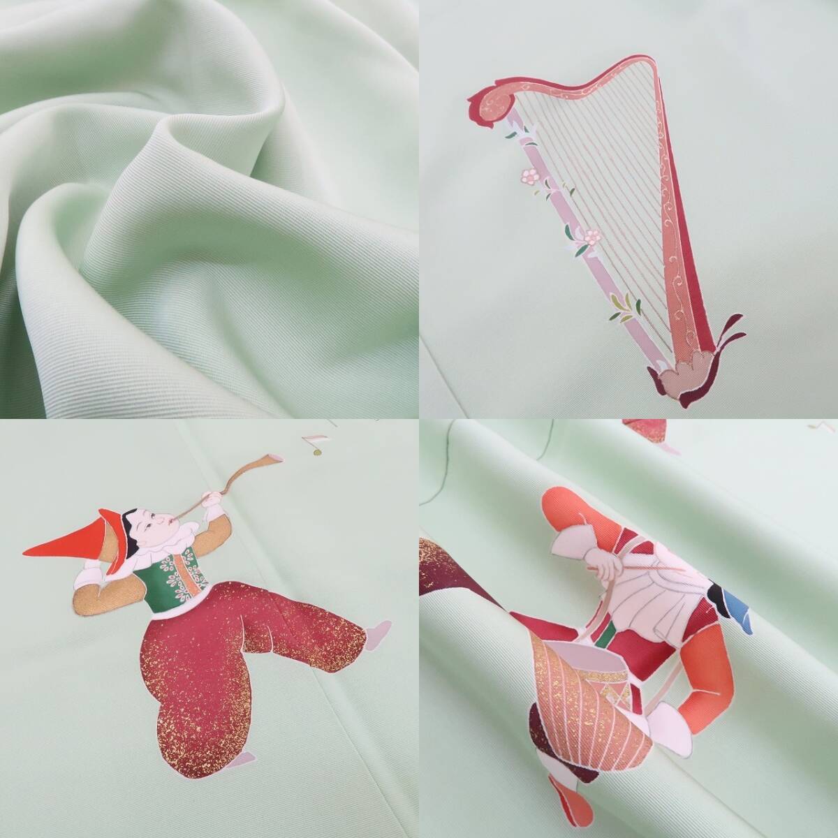 趣ある薄萌黄色の地に広がる柔らかな艶、巧みな構図に絵画の如く描きこまれた楽器を奏でる童子の一景、笛や太鼓にハープの音色が醸し出す心地よい温もり、それはモダンな意匠に息づく今をときめく和の色艶、洗練に薫るその表情は“創作着物の奥行”そのもの…気品漂う仕上がりがとても魅力的です。