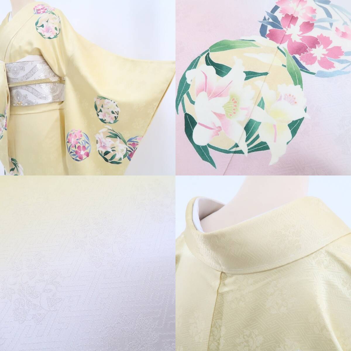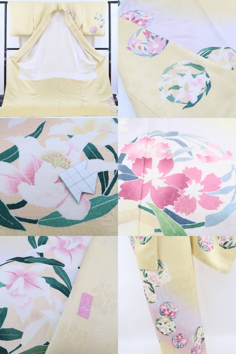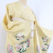 光沢ある淡黄色の色地に巧みな構図で描き込まれた可憐な花寄せのデザインモチーフ、巧みな色挿しが醸し出すえも言われぬ心地よい温もり、それは正に阿部佳雪が貴女に贈る“染めの真心”、彩色の妙に独特の感性が描き出す“美の世界”が極彩の美しさを醸しています。
