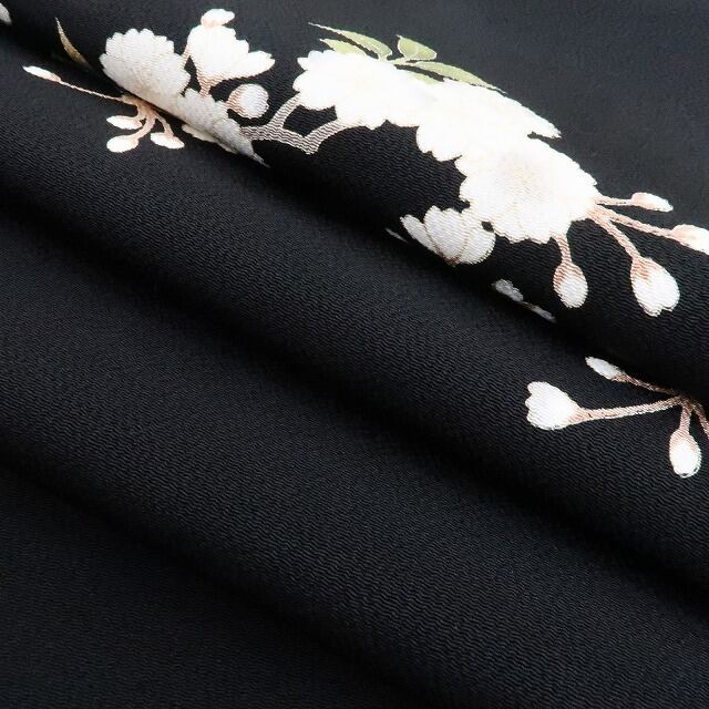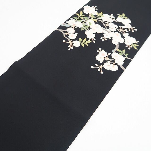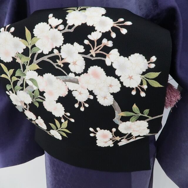 正絹素材のしなやかな質感に黒の帯地が放つ滑らかな光沢、まるで日本画のように描きこまれた桜の一景、それは正に洗練の意匠に薫り立つ和を心得た大人の色艶…醸し出される趣に誰をも惹きつけるこの帯の魅力が潜んでいます。