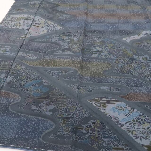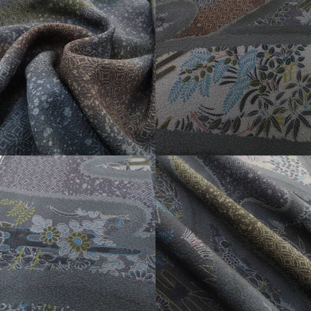 趣ある鉄御納戸色の彩色全面に謎めいた表情で浮かび上がる花や和柄の組み模様、それは正絹素材の滑らかな風合いに繰り広げられる“今をときめく幻想世界”、正に豊かな温もりに深みの濃淡を描く前田仁仙の世界観そのもの、“誰をも虜にする揺るぎない個性”、何とも言えない独特の色合いが着物の奥行を一段と美しく際立たせています。