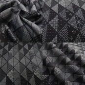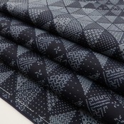 カタス式は、タテ・ヨコ2X2の一元式に対して“タテ絣1本・ヨコ絣2本”の糸構成、見た目は一元式の“十字型”と違い“T地型”の模様になります。