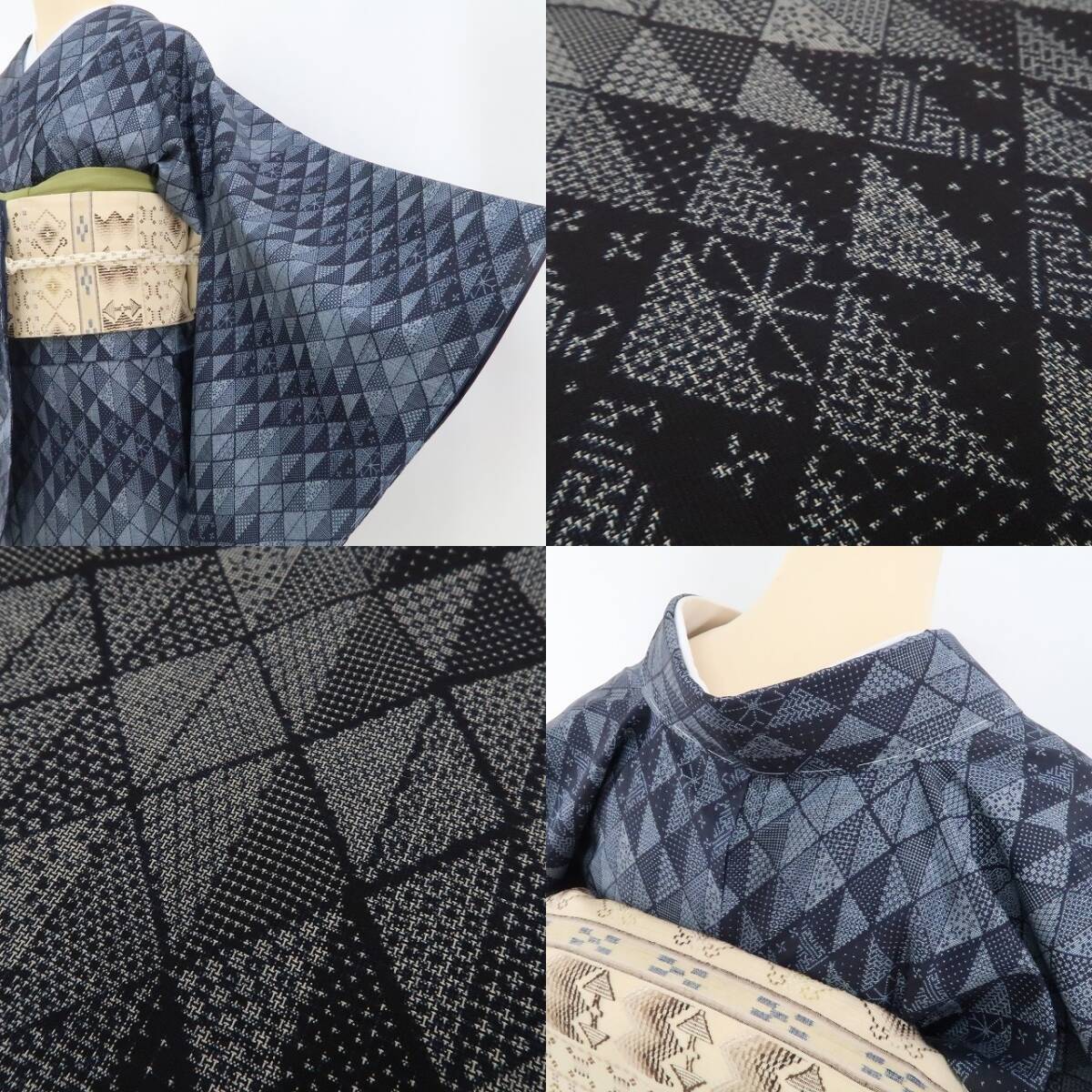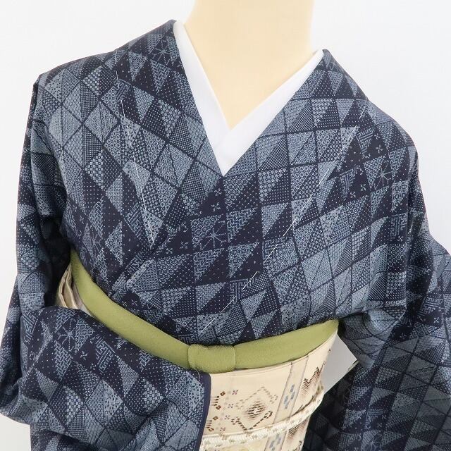 大島独特のシャリ感が活きる藍鉄色の清々しさ、斜め格子の濃淡に浮かび上がる洗練のモダンデザイン、ダイレクトに薫り立つブランド紬の見事な風合い、どれを取ってもその上質さは本場大島紬ならでは、素敵です。
