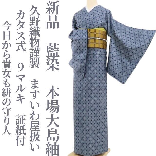 新品 久野織物謹製 ますいわ屋扱い“今日から貴女も絣の守り人”カタス式 9マルキ 証紙付 仕付け糸付 藍染 本場大島紬 4549