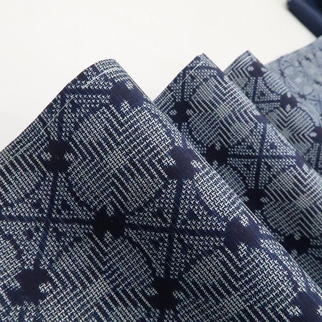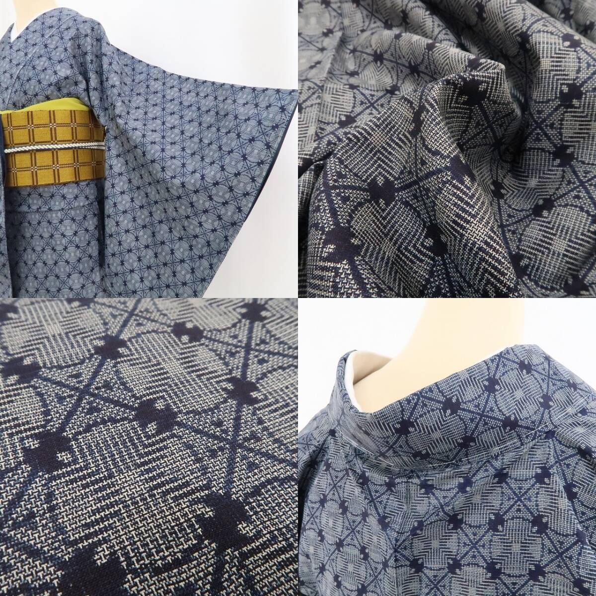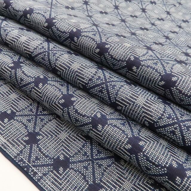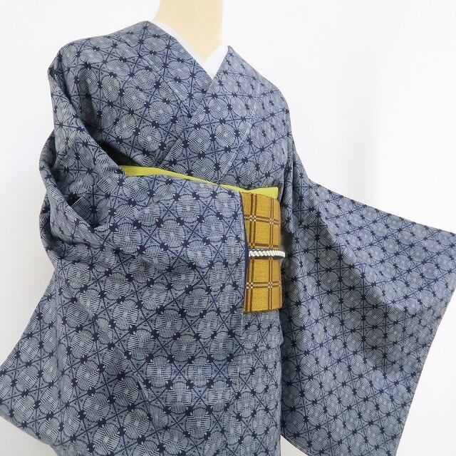 大島独特のシャリ感が活きる藍鉄色の清々しさ、色地全面に繋がれたシンメトリーなデザインライン、ダイレクトに薫り立つブランド紬の見事な風合い、どれを取ってもその上質さは本場大島紬ならでは、素敵です。