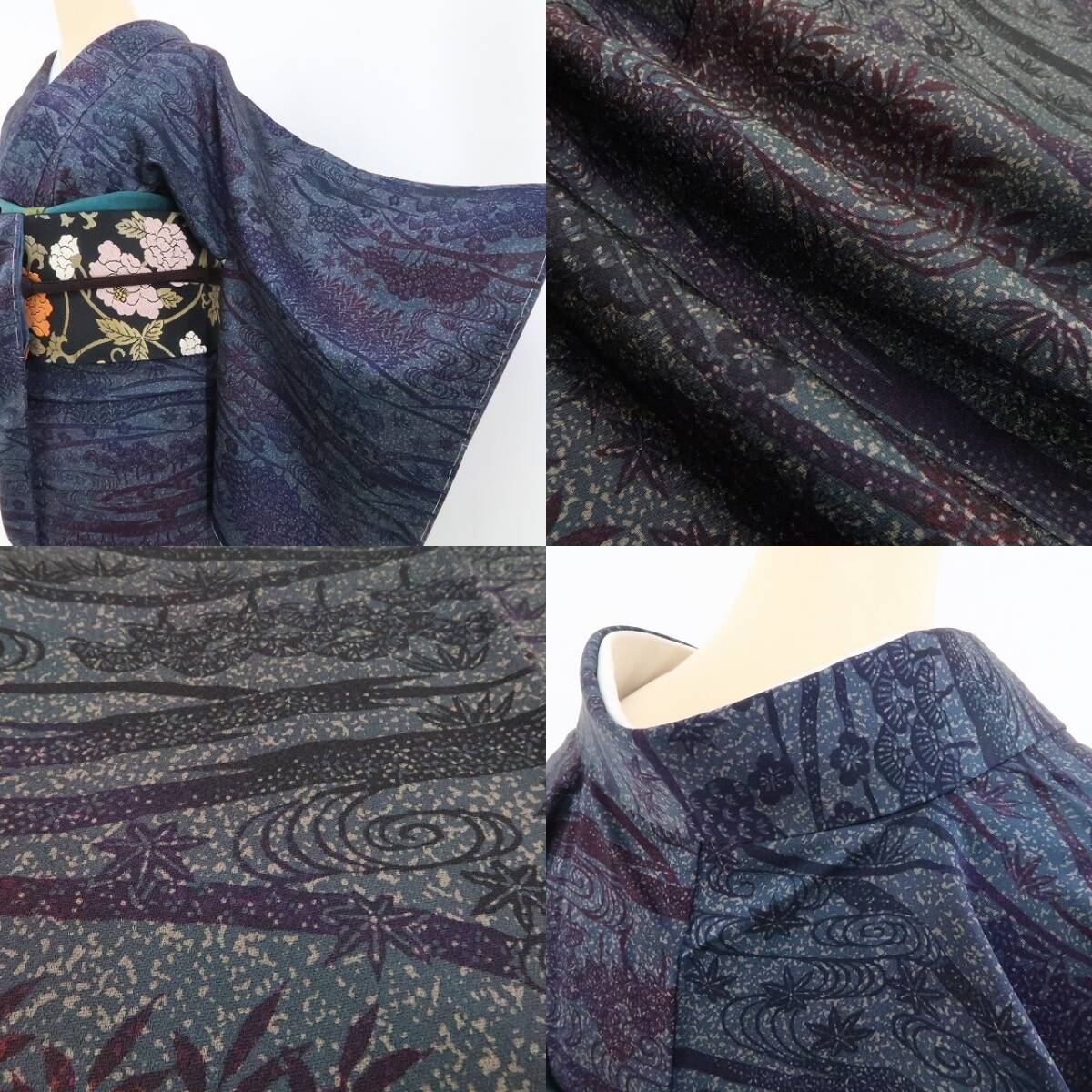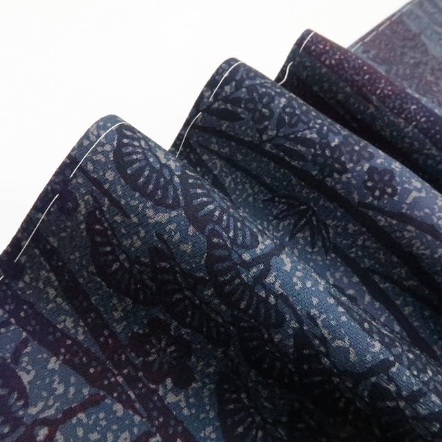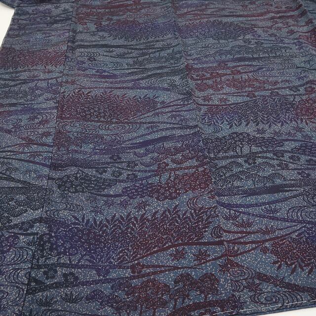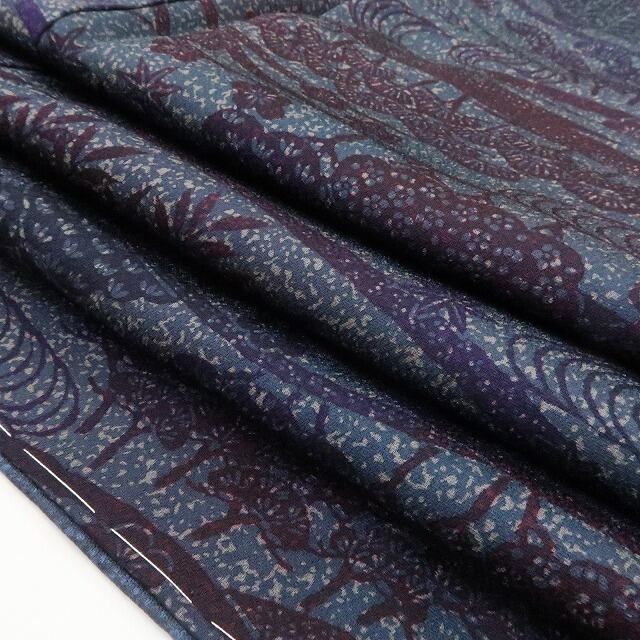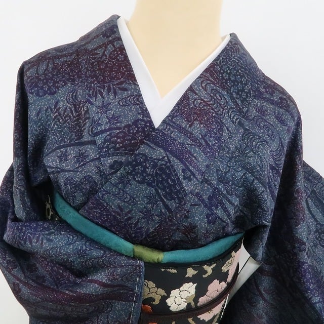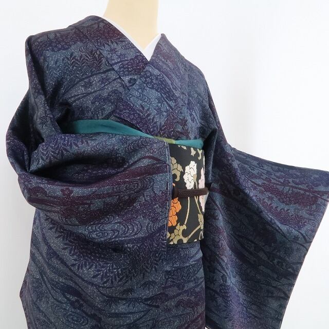紺鼠色を基調に多彩ながら同系の彩色が映し出す大人びた表情、全面にまるで現代絵画のようなタッチで描き込まれた花や草葉の色模様、意匠に醸し出されるえも言われぬ心地よい温もり、それは正に藤林徳扇の類稀なる感性が創り出す創作着物の世界観、素敵です。