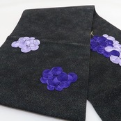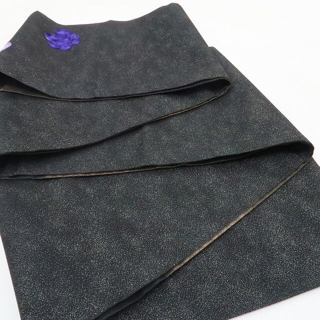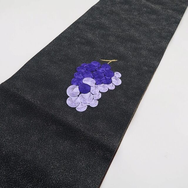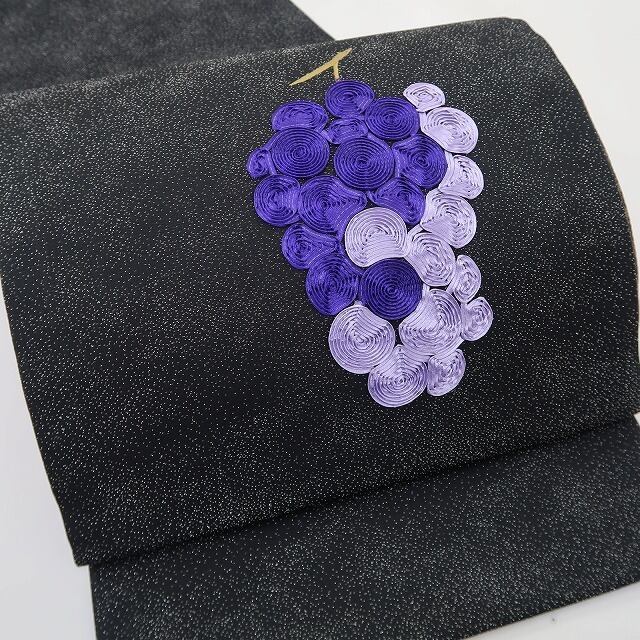 黒を舞台に銀色の巧みな美しさを輝かせ、幻想的に視線を誘う一面にぐるぐる、ふっくらとした姿で濃淡を見せて芳醇に薫り立ち、その一味違う魅力で銀河を映し夜空を一気に目覚めさせ、これから出会うお着物と貴女に新たな魅力を届ける“葡萄”が実る、“葡萄”銀通し正絹袋帯でございます。