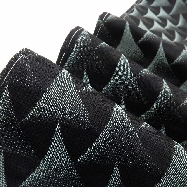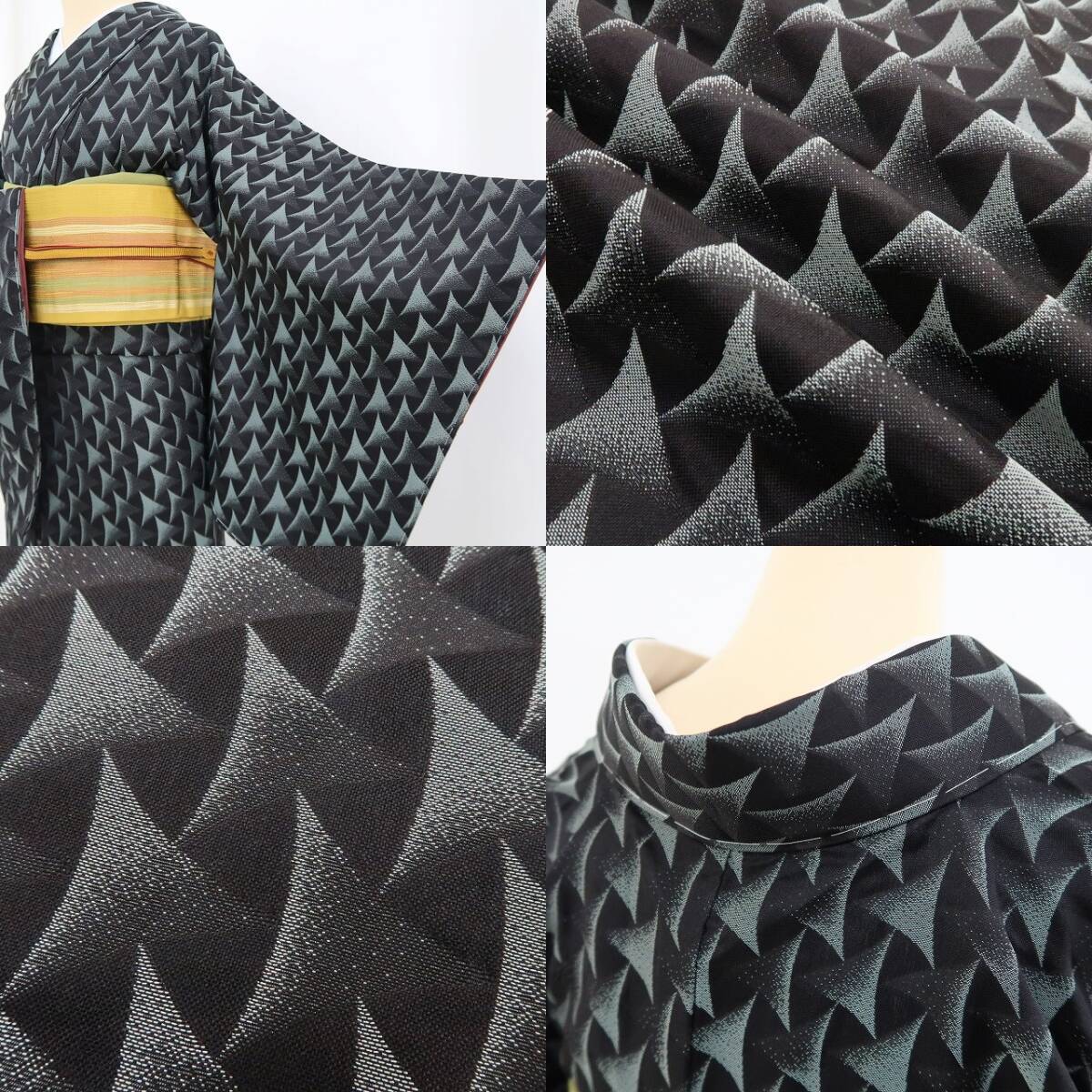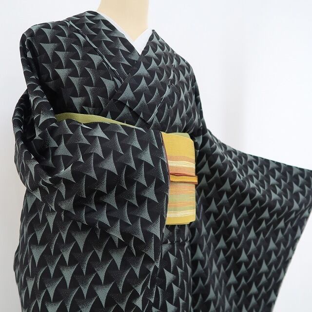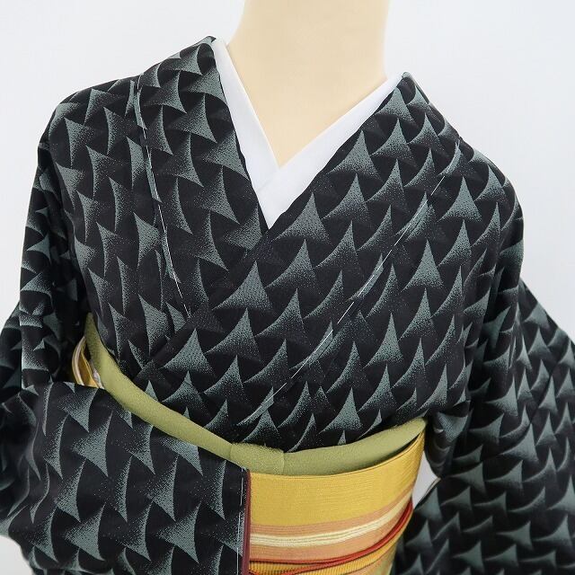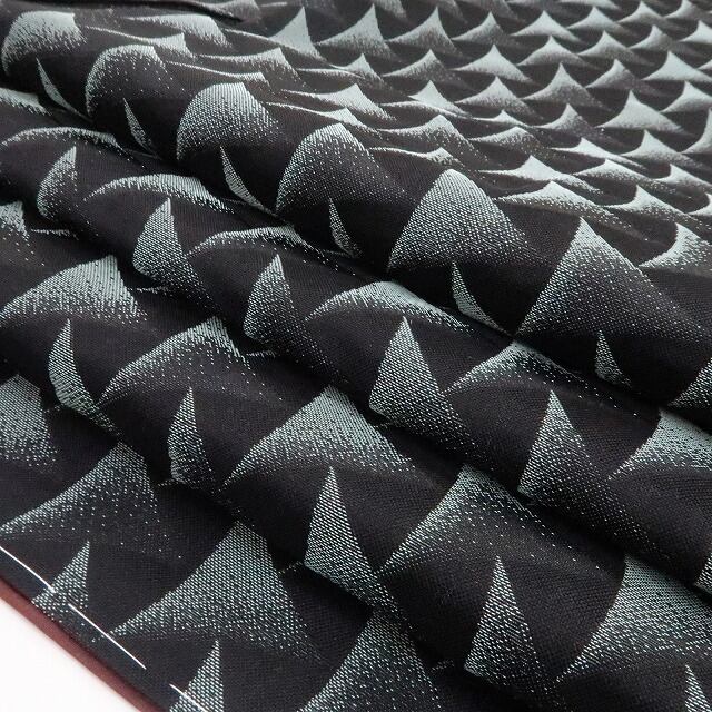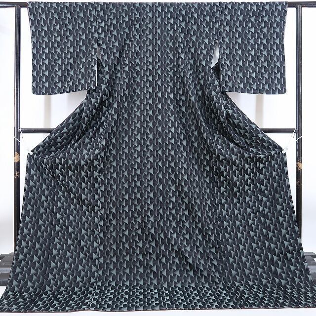 幻想的な表情を持つ三角形、黒×藍鼠色を巧みに操り生み出した飛翔は、静けさに羽音を響かせて整然と広がり、見方を変えれば、何かを編むような、木々が連なるような自然と想像力が沸き立つ柄となり、袖を通す貴女をはじめその姿を目にする者も楽しませる、正絹 仕付け糸付お召でございます。